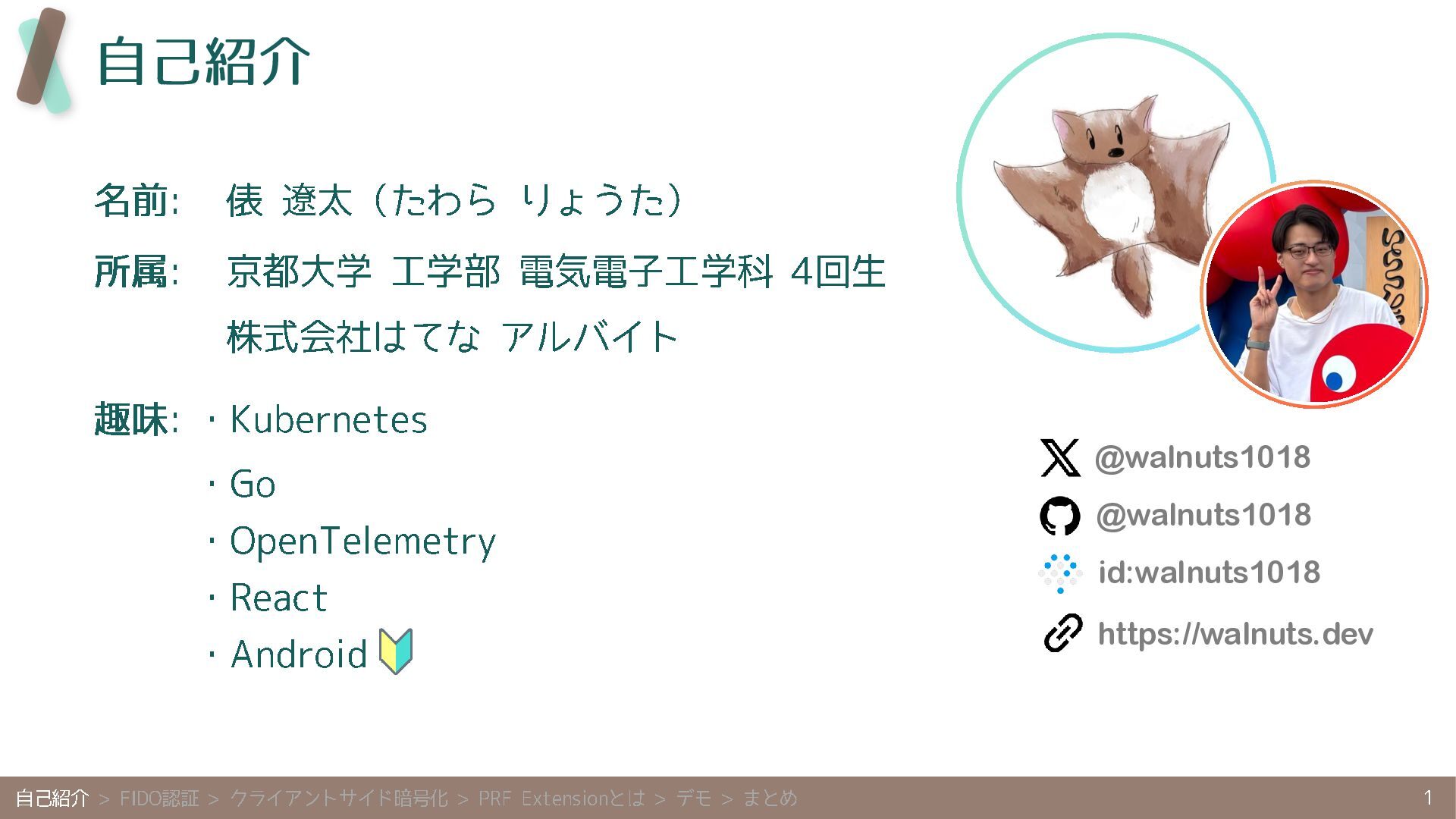 4俵俵 俵俵俵俵俵俵俵 俵俵俵俵俵 名名 : 俵 Kubernetes 俵 Go 俵 OpenTelemetry 俵 React 俵 Android 自己紹介 https://walnuts.dev @walnuts1018 @walnuts1018 id:walnuts1018 1 俵俵俵俵 > FIDO 俵俵 > 俵俵俵俵俵俵俵俵俵俵俵俵 > PRF Extension 俵俵 > 俵俵 > 俵俵俵
