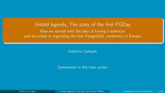 Federico Campoli, who had the original Idea and was actively involved in organising the conference will walk the audience through the adventure of organising the PGDay 2007 from scratch and how this sparked the birth of PostgreSQL Europe.