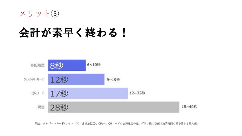 会計が素早く終わる! 現金、クレジットカード(サインレス)、非接触型(QUICPay)、QRコードの決済速度の差。グラフ横の数値は決済時間の最小値から最大値 。 メリット③