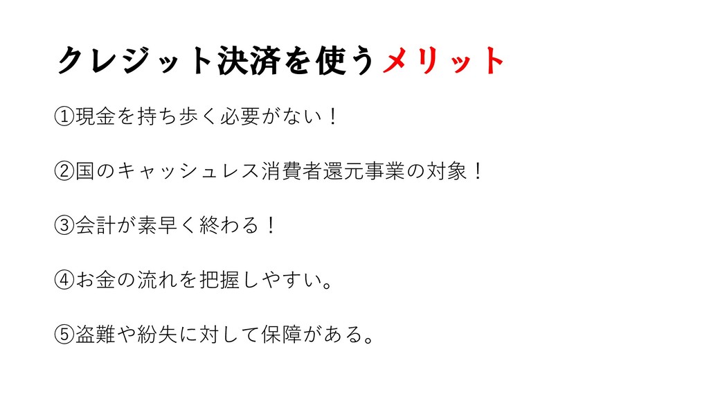 クレジット決済を使うメリット ①現金を持ち歩く必要がない! ②国のキャッシュレス消費者還元事業の対象! ③会計が素早く終わる! ④お金の流れを把握しやすい。 ⑤盗難や紛失に対して保障がある。