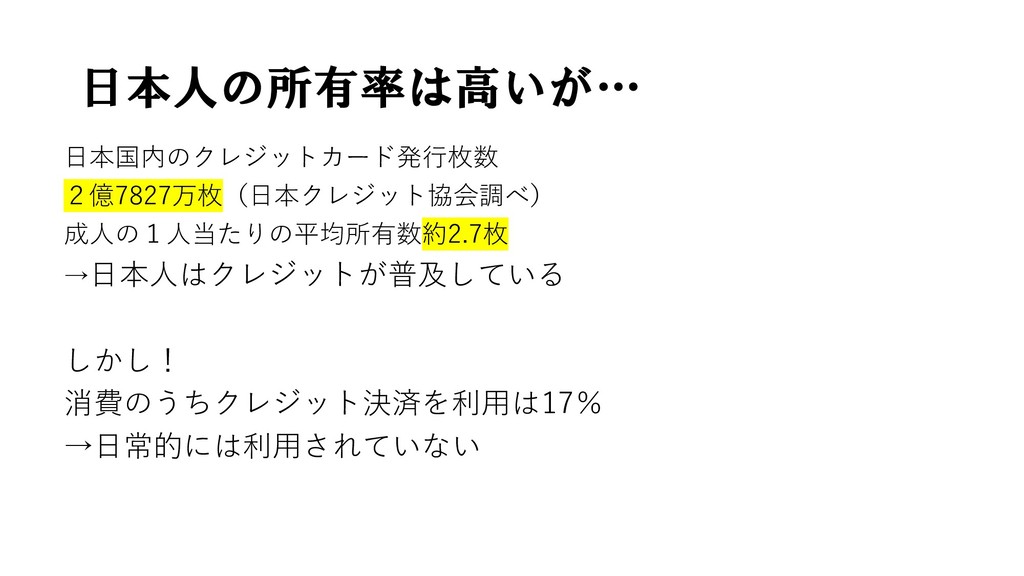 日本人の所有率は高いが… 日本国内のクレジットカード発行枚数 2億7827万枚(日本クレジット協会調べ) 成人の1人当たりの平均所有数約2.7枚 →日本人はクレジットが普及している しかし! 消費のうちクレジット決済を利用は17% →日常的には利用されていない