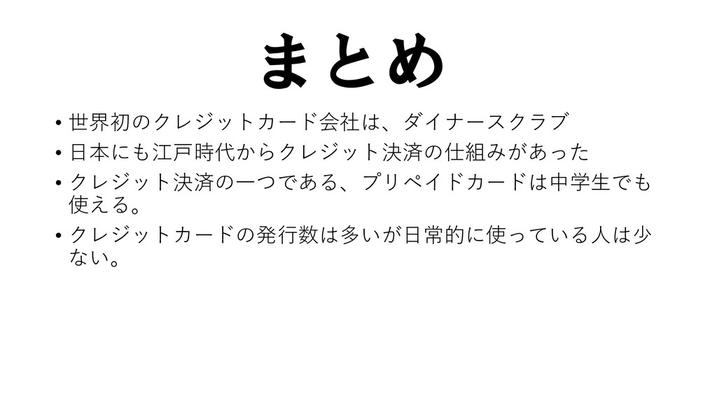 まとめ • 世界初のクレジットカード会社は、ダイナースクラブ • 日本にも江戸時代からクレジット決済の仕組みがあった • クレジット決済の一つである、プリペイドカードは中学生でも 使える。 • クレジットカードの発行数は多いが日常的に使っている人は少