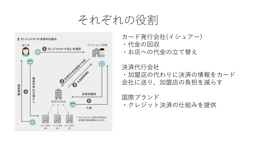 それぞれの役割 カード発行会社(イシュアー) ・代金の回収 ・お店への代金の立て替え 決済代行会社 ・加盟店の代わりに決済の情報をカード 会社に送り、加盟店の負担を減らす 国際ブランド ・クレジット決済の仕組みを提供