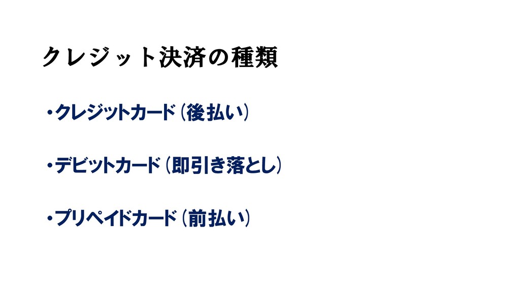 クレジット決済の種類 ・クレジットカード(後払い) ・デビットカード(即引き落とし) ・プリペイドカード(前払い)