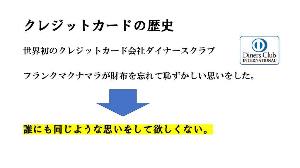 クレジットカードの歴史 世界初のクレジットカード会社ダイナースクラブ フランクマクナマラが財布を忘れて恥ずかしい思いをした。 誰にも同じような思いをして欲しくない。