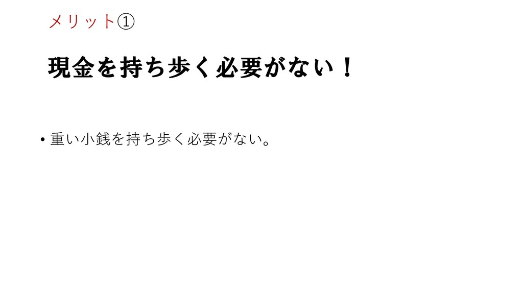 現金を持ち歩く必要がない! • 重い小銭を持ち歩く必要がない。 メリット①