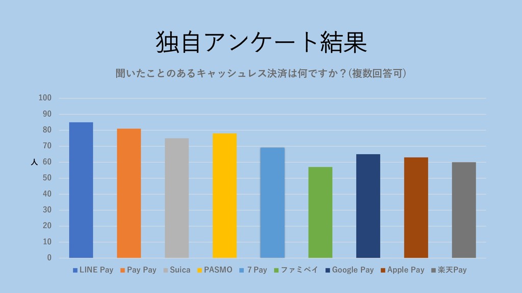 90 100 聞いたことのあるキャッシュレス決済は何ですか?(複数回答可) LINE Pay Pay Pay Suica PASMO 7Pay ファミペイ Google Pay Apple Pay 楽天Pay 人