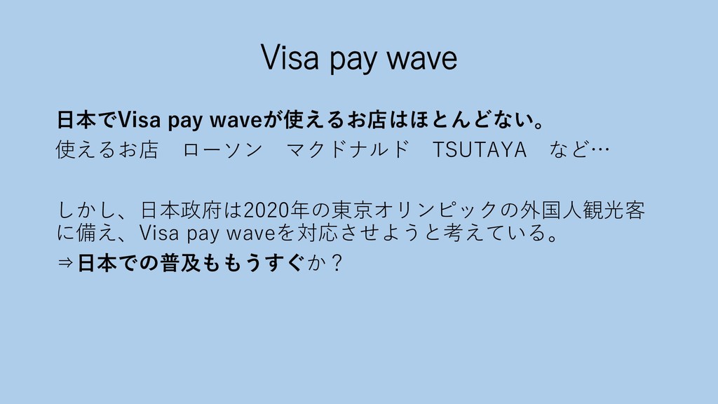 など… しかし、日本政府は2020年の東京オリンピックの外国人観光客 に備え、Visa pay waveを対応させようと考えている。 ⇒日本での普及ももうすぐか?