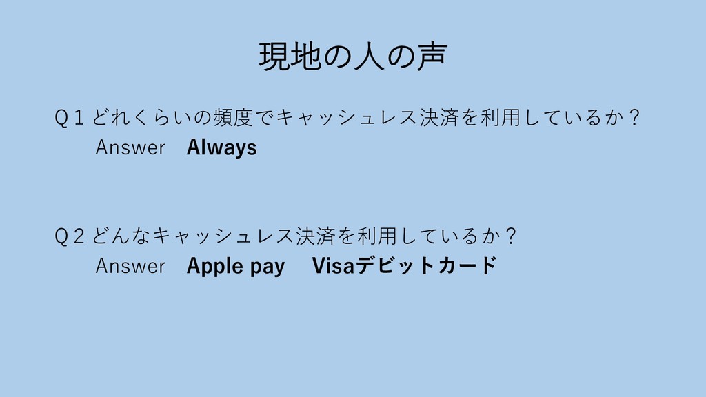 4. 現地の人の声 Q3キャッシュレス決済についてどのように思うか? Answer Easy Useful Love Q4オーストラリアではどのくらいの店がキャッシュレス決済に 対応しているか? Answer All