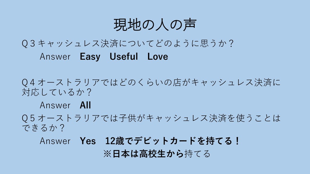 Q5オーストラリアでは子供がキャッシュレス決済を使うことは できるか? Answer Yes 12歳でデビットカードを持てる! ※日本は高校生から持てる