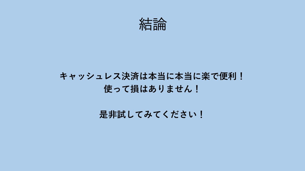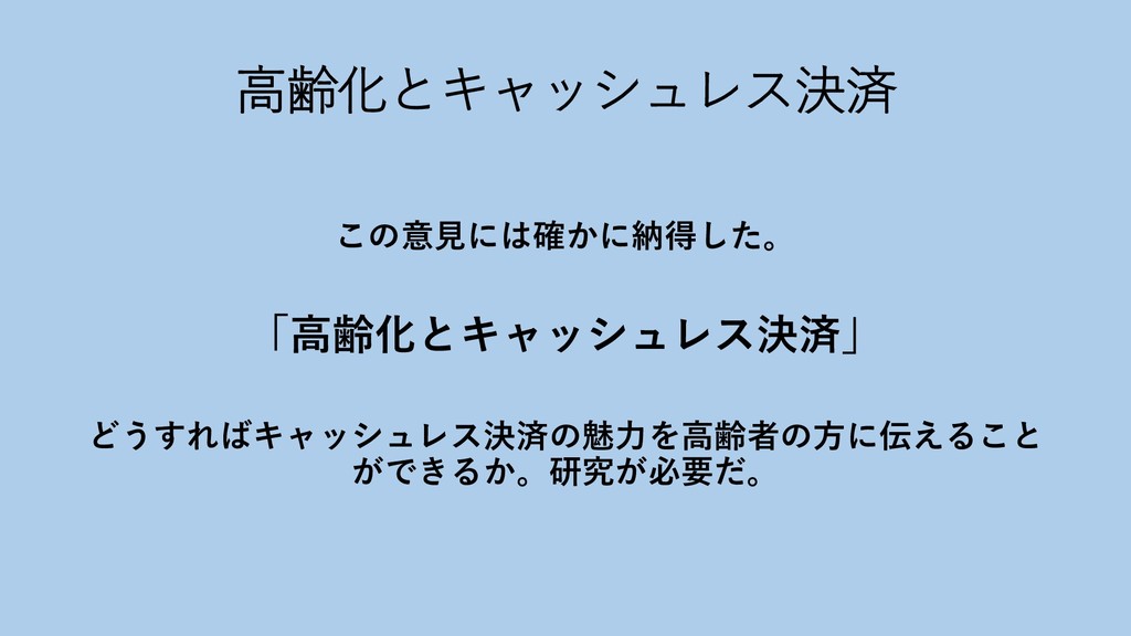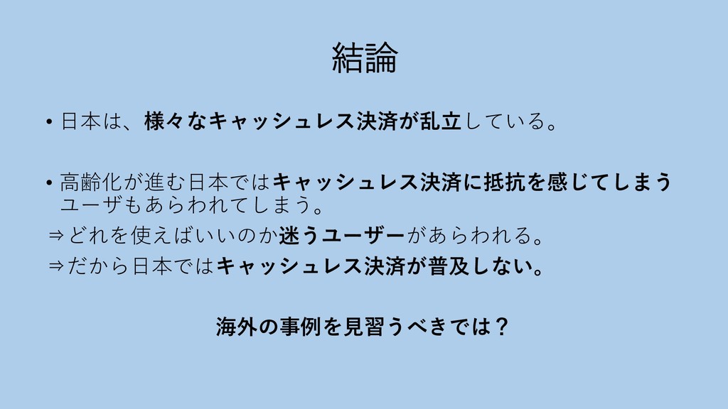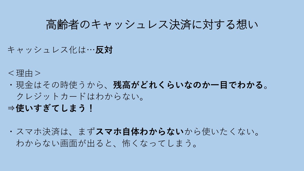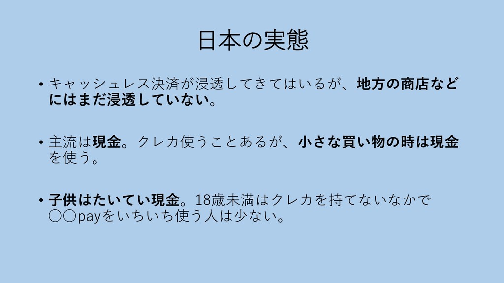 • 高齢化が進む中で幅広い年代層にキャッシュレス決済が浸透し ていない。 ⇒高齢化とキャッシュレス決済 • 日本ではクレジットカードは一般的に決済端末に磁気ストライ プを通す方法。 ⇒タッチ決済と違い面倒。
