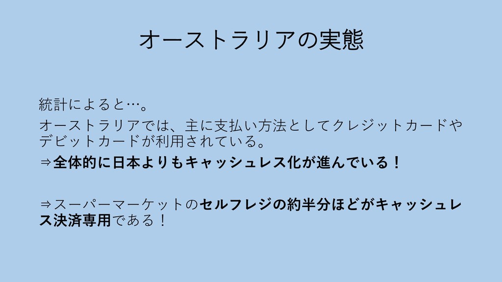 学習発表会で利用した日本及びオーストラリアでのキャッシュレスの情勢についての資料です。