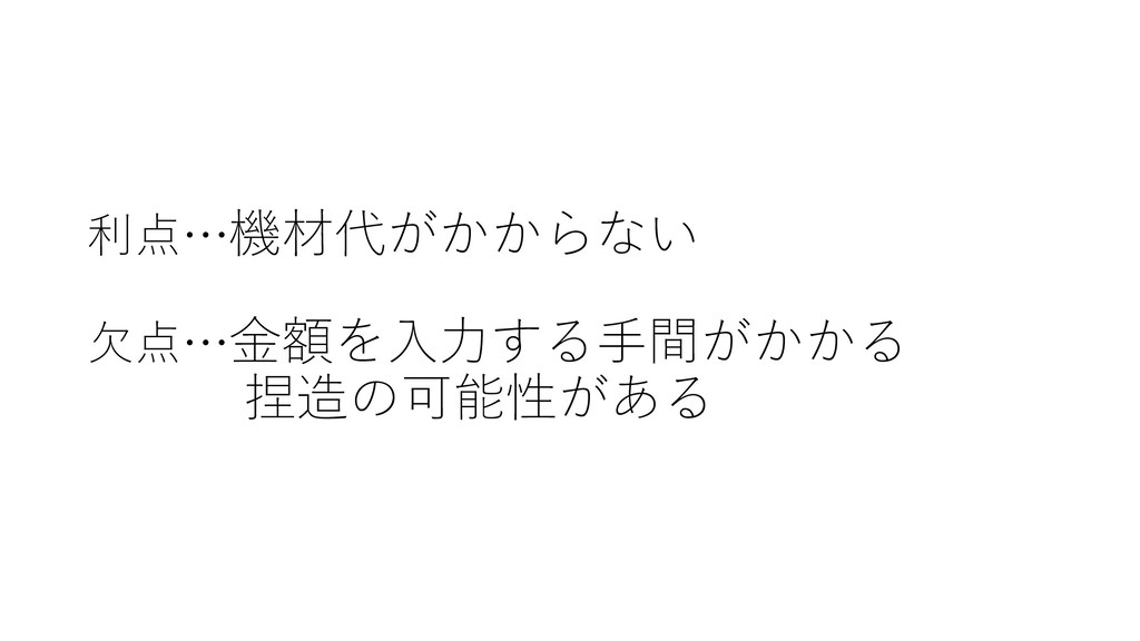 利点…機材代がかからない 欠点…金額を入力する手間がかかる 捏造の可能性がある