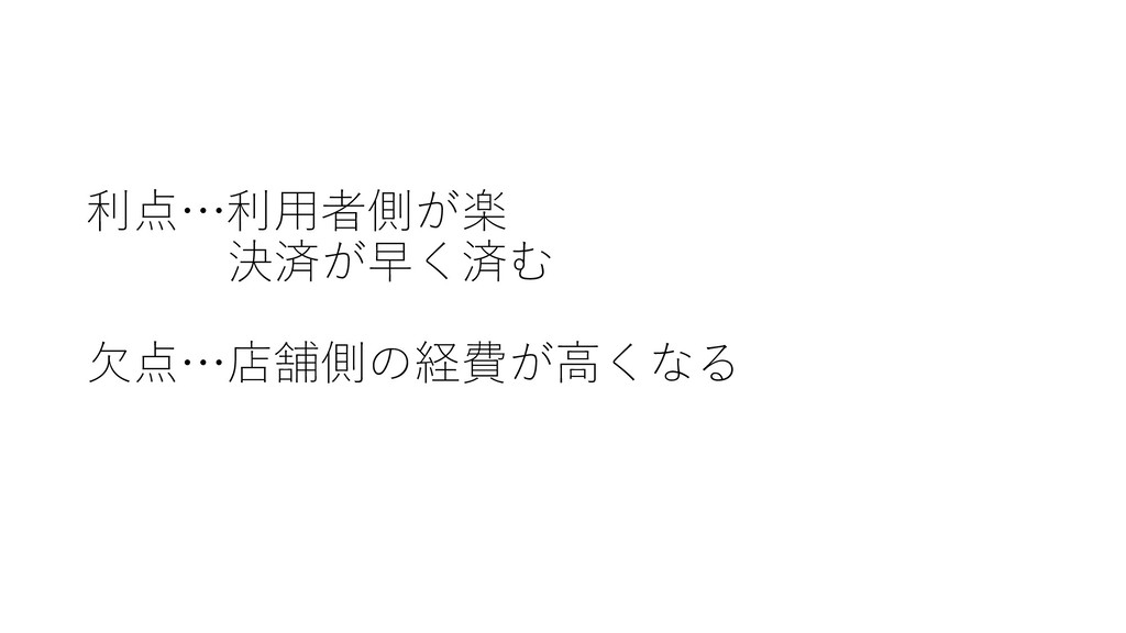 利点…利用者側が楽 決済が早く済む 欠点…店舗側の経費が高くなる