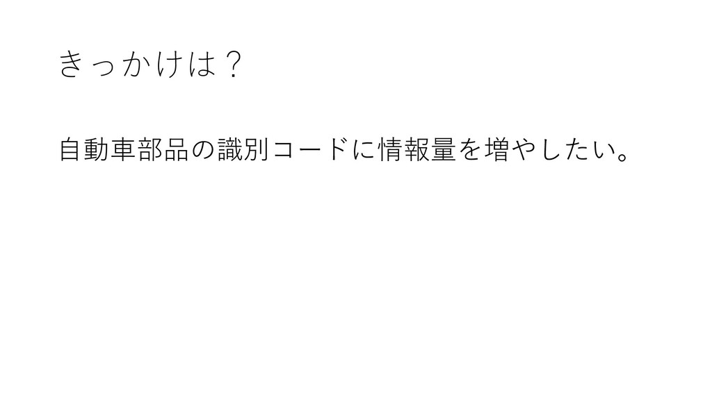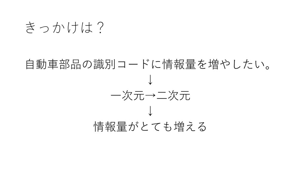 きっかけは? 自動車部品の識別コードに情報量を増やしたい。 ↓ 一次元→二次元 ↓ 情報量がとても増える