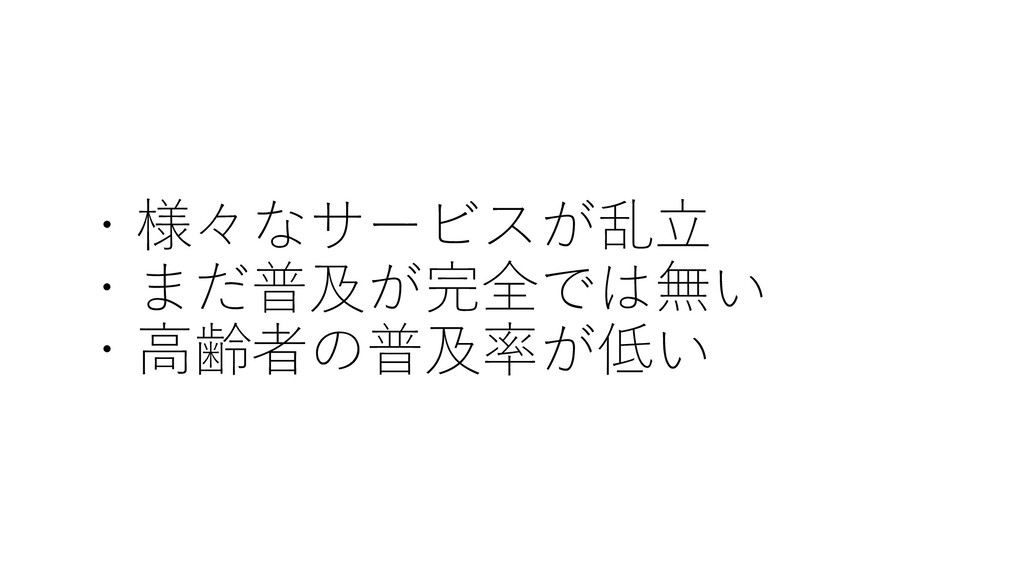 ・様々なサービスが乱立 ・まだ普及が完全では無い ・高齢者の普及率が低い