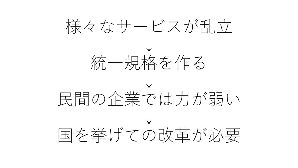 様々なサービスが乱立 ↓ 統一規格を作る ↓ 民間の企業では力が弱い ↓ 国を挙げての改革が必要