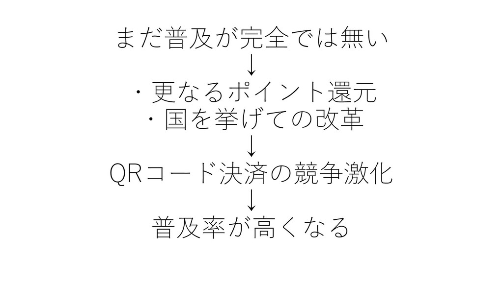 まだ普及が完全では無い ↓ ・更なるポイント還元 ・国を挙げての改革 ↓ QRコード決済の競争激化 ↓ 普及率が高くなる