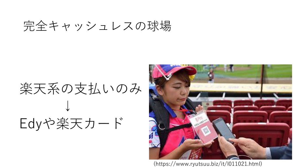 (https://www.ryutsuu.biz/it/l011021.html) 楽天系の支払いのみ Edyや楽天カード 完全キャッシュレスの球場 ↓