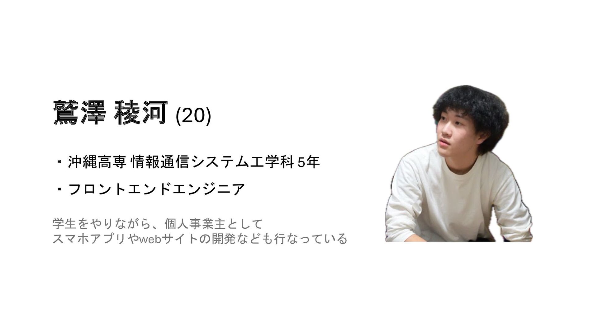 鷲澤 稜河 (20) ・沖縄高専 情報通信システム工学科 5年 ・フロントエンドエンジニア 学生をやりながら、個人事業主として スマホアプリやwebサイトの開発なども行なっている