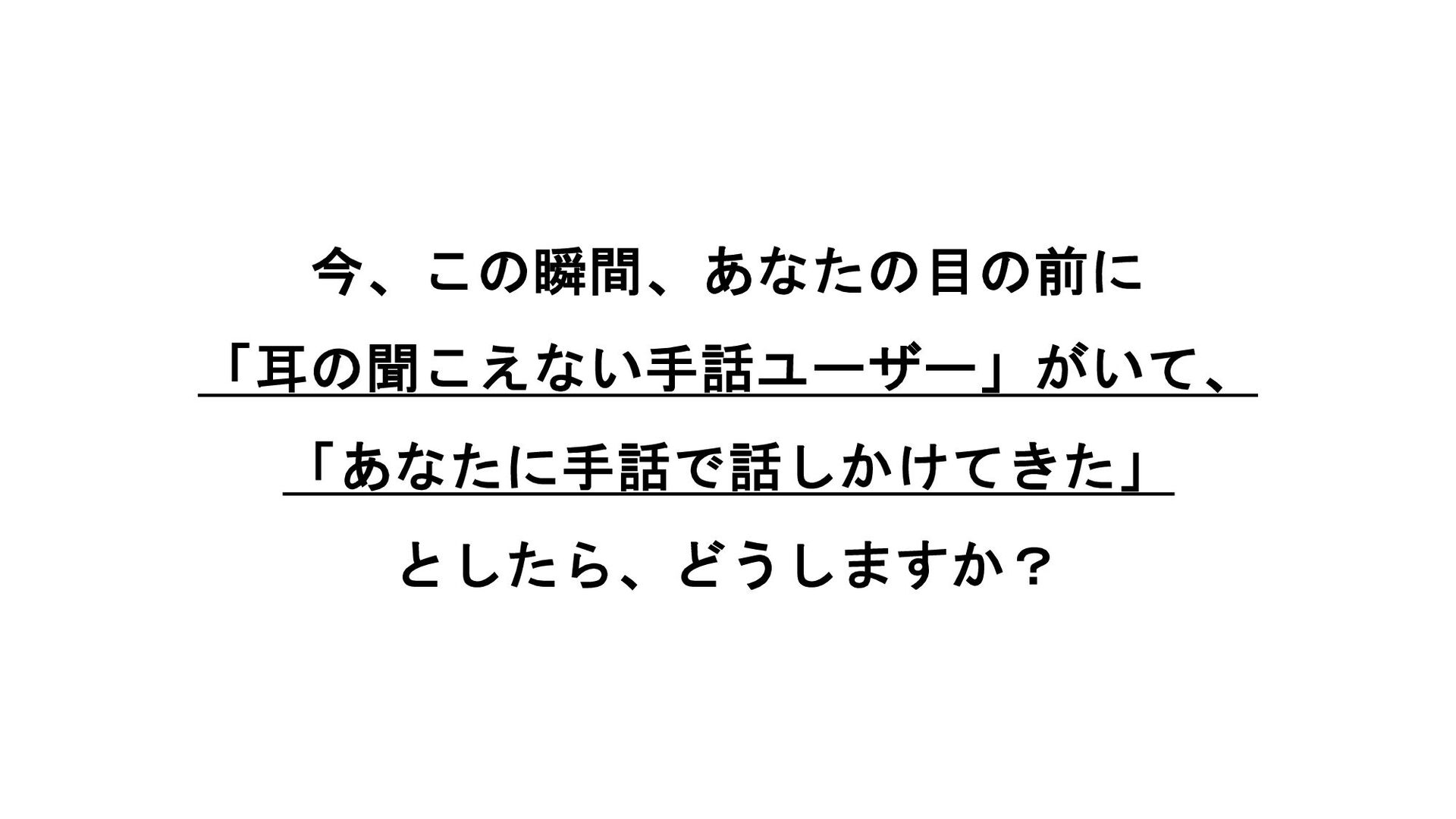 今、この瞬間、あなたの目の前に 「耳の聞こえない手話ユーザー」がいて、 「あなたに手話で話しかけてきた」 としたら、どうしますか?