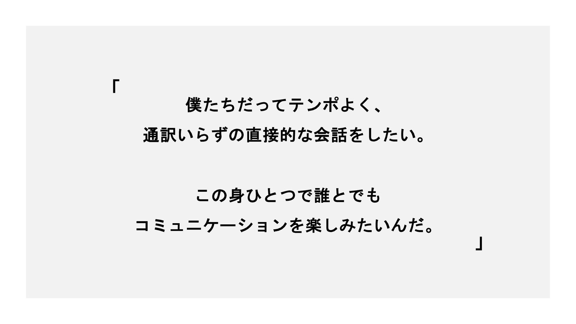 僕たちだってテンポよく、 通訳いらずの直接的な会話をしたい。 この身ひとつで誰とでも コミュニケーションを楽しみたいんだ。 「 」