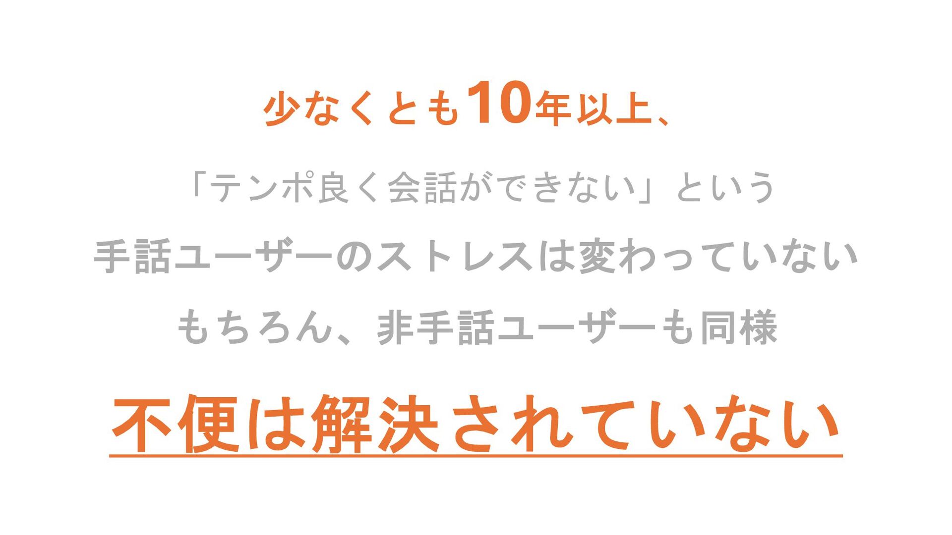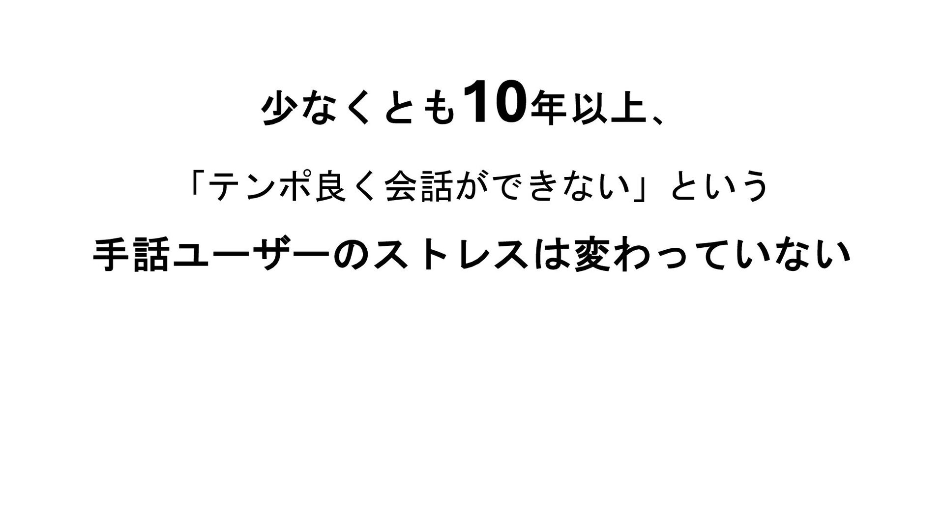 少なくとも10年以上、 「テンポ良く会話ができない」という 手話ユーザーのストレスは変わっていない もちろん、非手話ユーザーも同様 不便は解決されていない