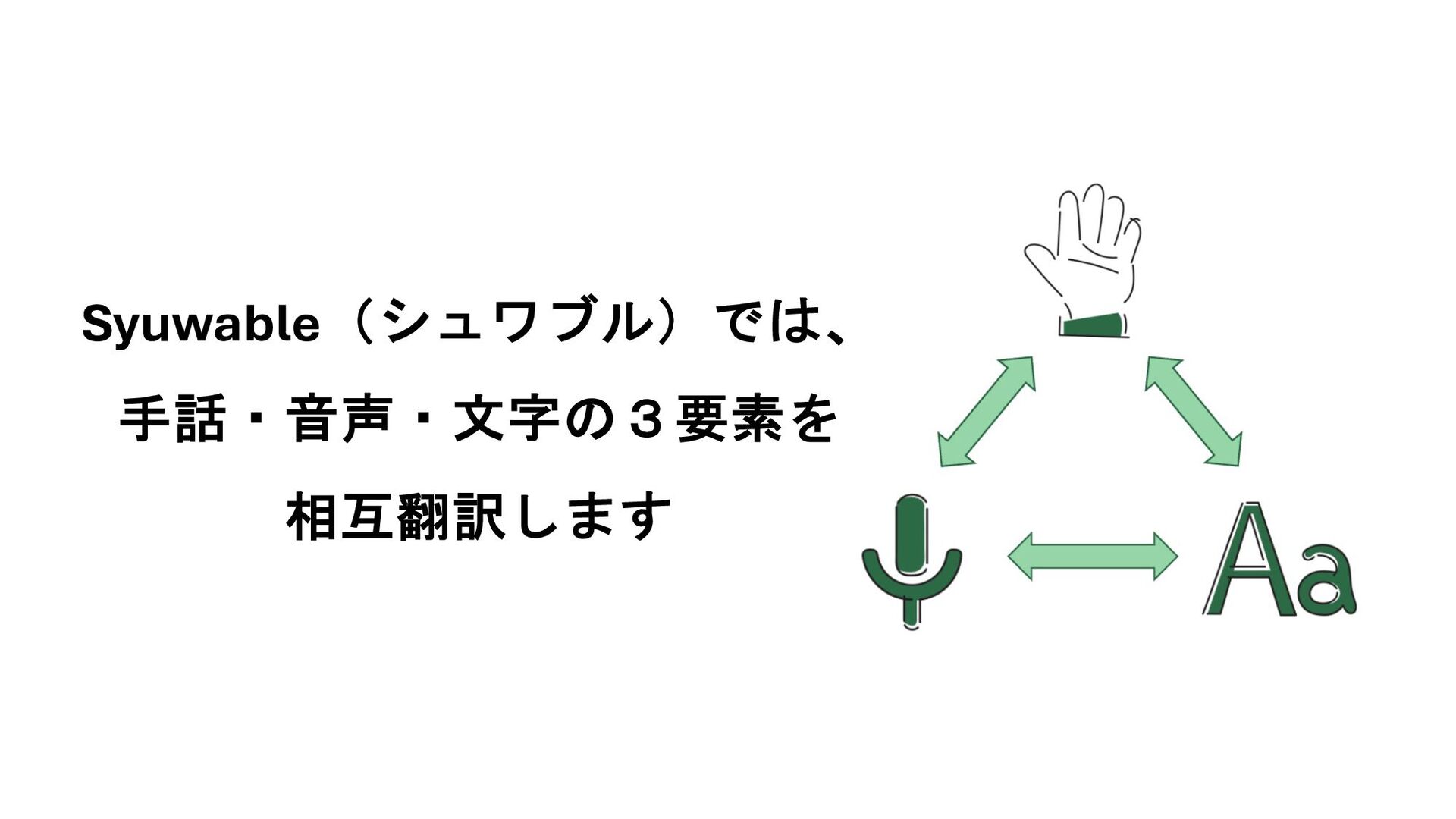 Syuwable(シュワブル)では、 手話・音声・文字の3要素を 相互翻訳します