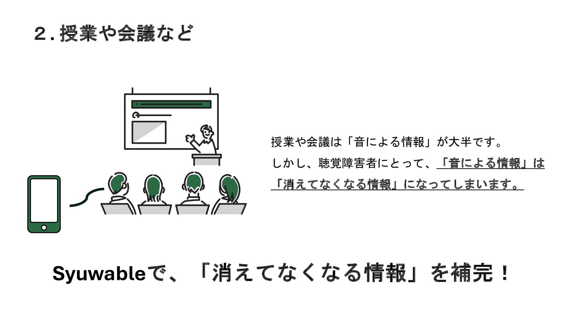 2. 授業や会議など 授業や会議は「音による情報」が大半です。 しかし、聴覚障害者にとって、「音による情報」は 「消えてなくなる情報」になってしまいます。 Syuwableで、「消えてなくなる情報」を補完!