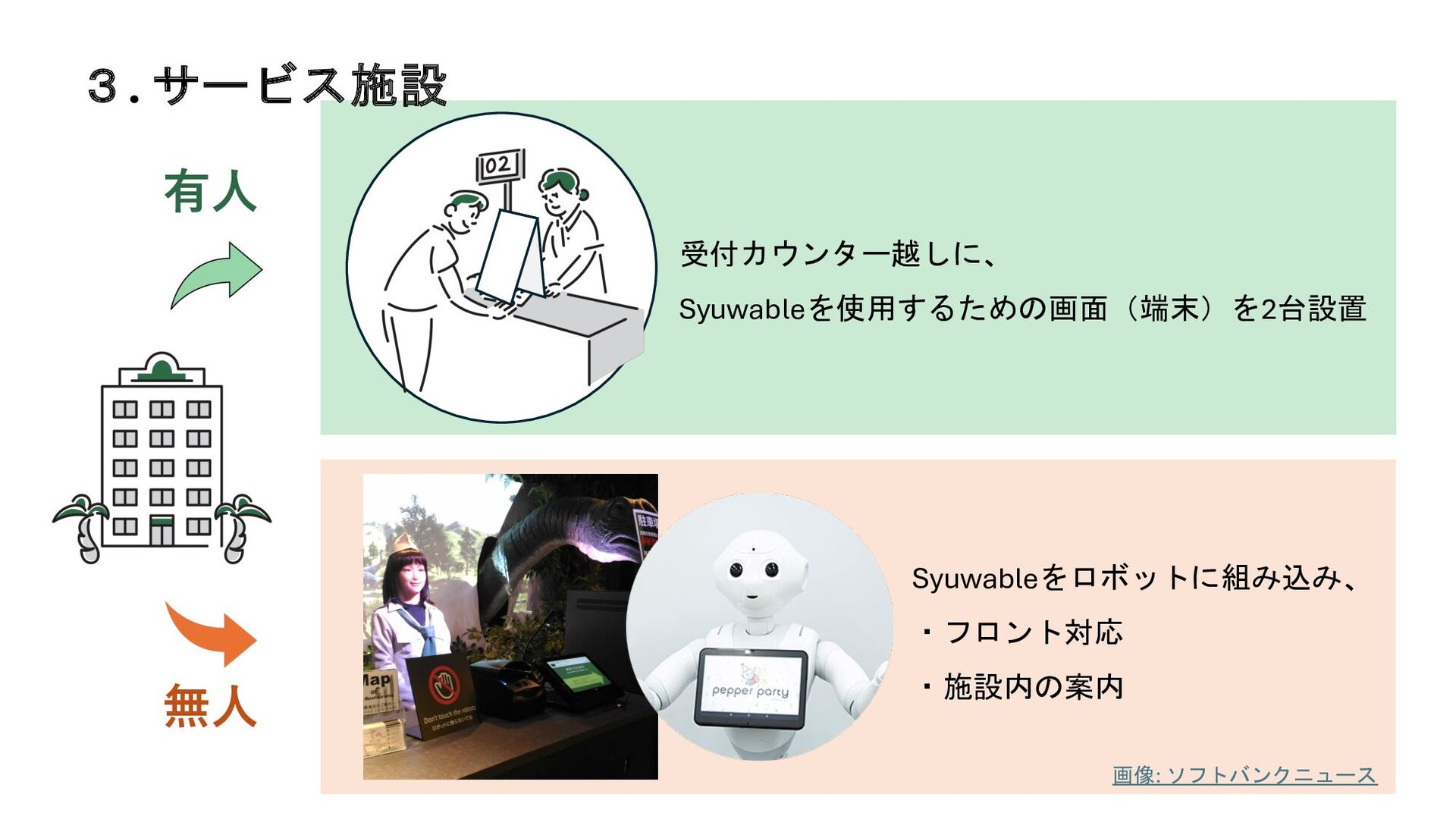 3. サービス施設 有⼈ 無⼈ 画像: ソフトバンクニュース 受付カウンター越しに、 Syuwableを使用するための画面(端末)を2台設置 Syuwableをロボットに組み込み、 ・フロント対応