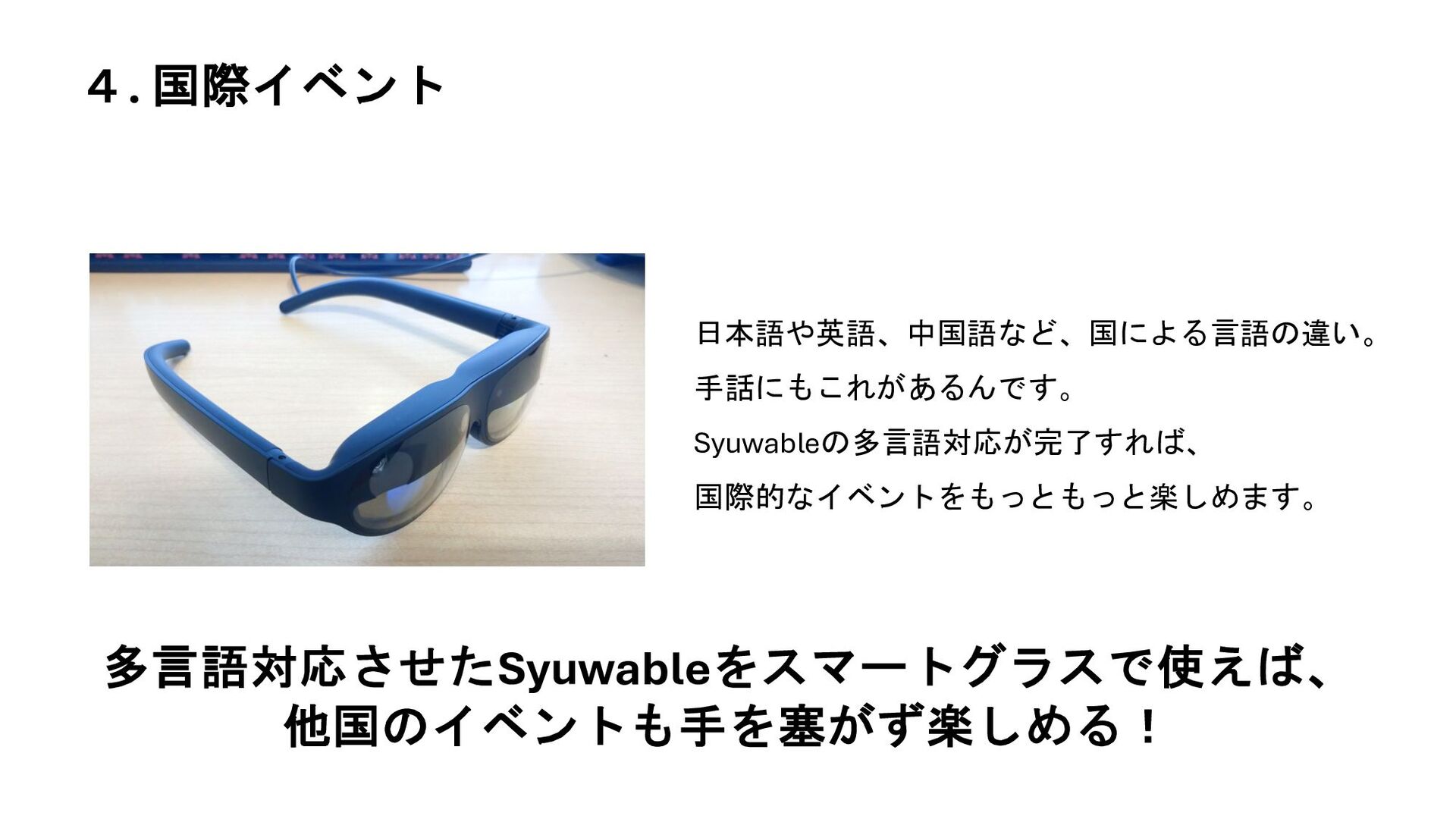 4. 国際イベント 日本語や英語、中国語など、国による言語の違い。 手話にもこれがあるんです。 Syuwableの多言語対応が完了すれば、 国際的なイベントをもっともっと楽しめます。 多言語対応させたSyuwableをスマートグラスで使えば、 他国のイベントも手を塞がず楽しめる!