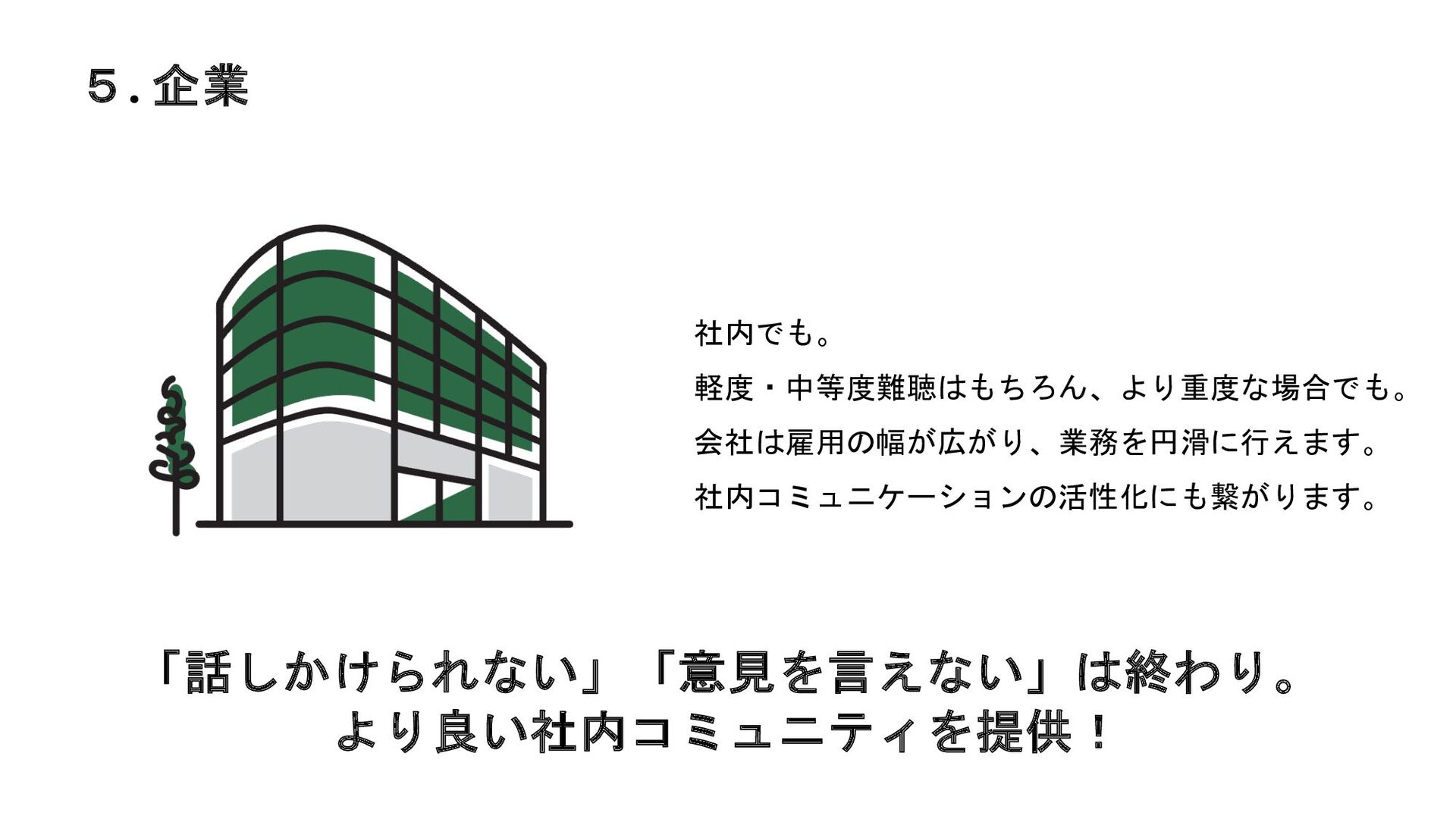 5. 企業 社内でも。 軽度・中等度難聴はもちろん、より重度な場合でも。 会社は雇用の幅が広がり、業務を円滑に行えます。 社内コミュニケーションの活性化にも繋がります。 「話しかけられない」「意見を言えない」は終わり。 より良い社内コミュニティを提供!