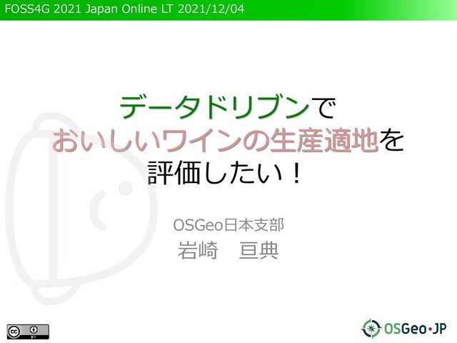 FOSS4G 2021 Japan Online LT 2021/12/04 データドリブンで おいしいワインの生産適地を 評価したい! OSGeo日本支部