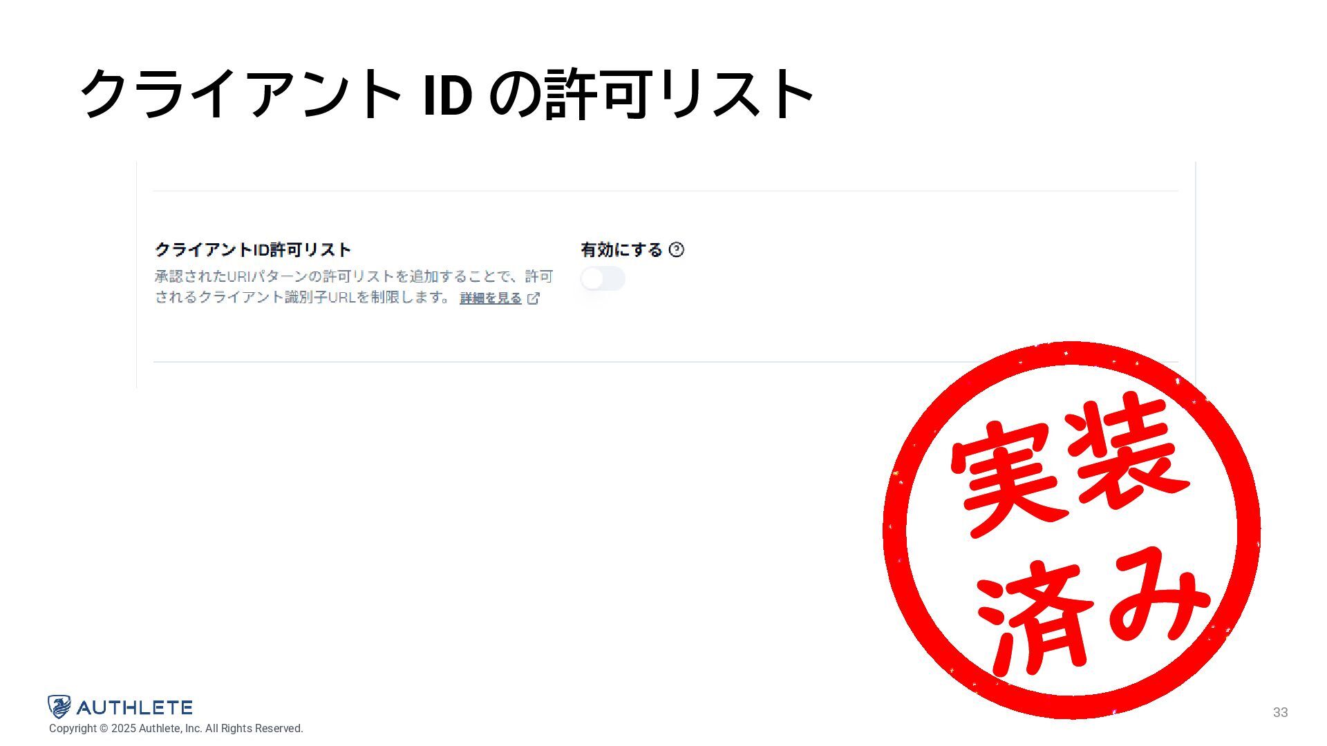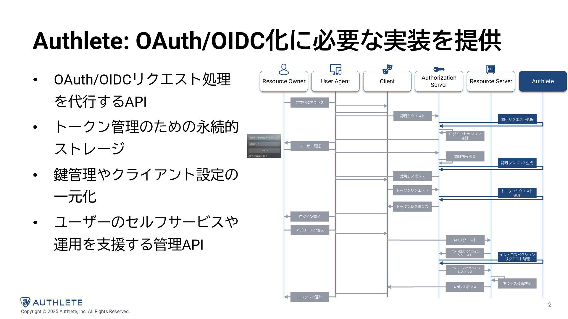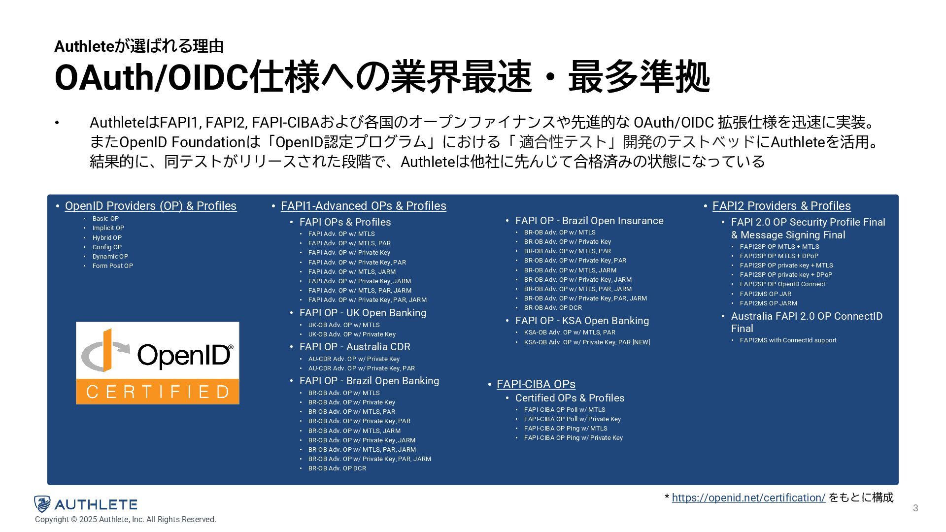 FAPI2, FAPI-CIBAおよび各国のオープンファイナンスや先進的な OAuth/OIDC 拡張仕様を迅速に実装。 またOpenID Foundationは「OpenID認定プログラム」における「 適合性テスト」開発のテストベッドにAuthleteを活用。 結果的に、同テストがリリースされた段階で、Authleteは他社に先んじて合格済みの状態になっている Authleteが選ばれる理由 OAuth/OIDC仕様への業界最速・最多準拠 • OpenID Providers (OP) & Profiles • Basic OP • Implicit OP • Hybrid OP • Config OP • Dynamic OP • Form Post OP • FAPI1-Advanced OPs & Profiles • FAPI OPs & Profiles • FAPI Adv. OP w/ MTLS • FAPI Adv. OP w/ MTLS, PAR • FAPI Adv. OP w/ Private Key • FAPI Adv. OP w/ Private Key, PAR • FAPI Adv. OP w/ MTLS, JARM • FAPI Adv. OP w/ Private Key, JARM • FAPI Adv. OP w/ MTLS, PAR, JARM • FAPI Adv. OP w/ Private Key, PAR, JARM • FAPI OP - UK Open Banking • UK-OB Adv. OP w/ MTLS • UK-OB Adv. OP w/ Private Key • FAPI OP - Australia CDR • AU-CDR Adv. OP w/ Private Key • AU-CDR Adv. OP w/ Private Key, PAR • FAPI OP - Brazil Open Banking • BR-OB Adv. OP w/ MTLS • BR-OB Adv. OP w/ Private Key • BR-OB Adv. OP w/ MTLS, PAR • BR-OB Adv. OP w/ Private Key, PAR • BR-OB Adv. OP w/ MTLS, JARM • BR-OB Adv. OP w/ Private Key, JARM • BR-OB Adv. OP w/ MTLS, PAR, JARM • BR-OB Adv. OP w/ Private Key, PAR, JARM • BR-OB Adv. OP DCR • FAPI OP - Brazil Open Insurance • BR-OB Adv. OP w/ MTLS • BR-OB Adv. OP w/ Private Key • BR-OB Adv. OP w/ MTLS, PAR • BR-OB Adv. OP w/ Private Key, PAR • BR-OB Adv. OP w/ MTLS, JARM • BR-OB Adv. OP w/ Private Key, JARM • BR-OB Adv. OP w/ MTLS, PAR, JARM • BR-OB Adv. OP w/ Private Key, PAR, JARM • BR-OB Adv. OP DCR • FAPI OP - KSA Open Banking • KSA-OB Adv. OP w/ MTLS, PAR • KSA-OB Adv. OP w/ Private Key, PAR [NEW] • FAPI-CIBA OPs • Certified OPs & Profiles • FAPI-CIBA OP Poll w/ MTLS • FAPI-CIBA OP Poll w/ Private Key • FAPI-CIBA OP Ping w/ MTLS • FAPI-CIBA OP Ping w/ Private Key • FAPI2 Providers & Profiles • FAPI 2.0 OP Security Profile Final & Message Signing Final • FAPI2SP OP MTLS + MTLS • FAPI2SP OP MTLS + DPoP • FAPI2SP OP private key + MTLS • FAPI2SP OP private key + DPoP • FAPI2SP OP OpenID Connect • FAPI2MS OP JAR • FAPI2MS OP JARM • Australia FAPI 2.0 OP ConnectID Final • FAPI2MS with ConnectId support 3 * https://openid.net/certification/ をもとに構成