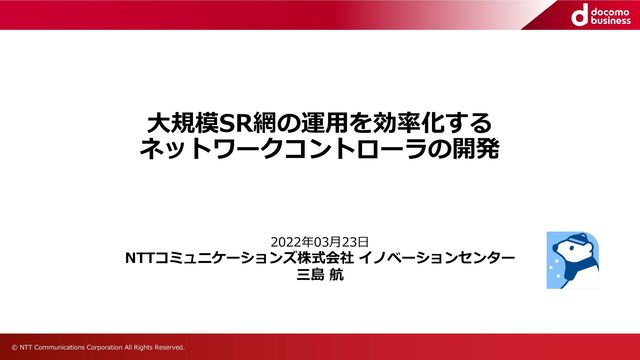 • NTT Com独⾃のMulti-AS Segment Routingアーキテクチャを考案、運⽤中 ◦ マルチASかつマルチベンダにおけるSR-MPLS TEの実現: https://mpls.jp/2021/presentations/20211101_MPLSJAPAN_NTTCOM_tajima_pub.pdf • ⼤規模SR網には多くの特⻑があるが、運⽤課題も存在 ◦ ネットワーク状態の把握や効率的な経路管理が困難 ▪ トポロジ、Interface状態、コンフィグやログを⼀元管理したい ▪ 経路・Backup-PathやSFCを直感的に把握したい ◦ 利⽤者の増加に伴う管理の煩雑化や作業時間の肥⼤化 ▪ 上記の解決のため、以前にユーザによるセルフマネージ化を提案 • ユーザによるセルフマネージ可能なネットワークサービス運⽤システムの事例: https://onic.jp/_cms/wp-content/uploads/2019/11/onic2019_tajima.pdf ▪ 利⽤者⾃⾝がサービスを直感的に理解し、権限の中で⾃ら選択 → 運⽤効率化や検証業務改善のため、可視化とネットワーク制御を実現するコントローラが欲しい︕ Customer CE CE Customer Customer AS AS SR-MPLS domain Inter-AS MPLS Interwork ASBR P SRv6 domain PE/ASBR PE/ASBR P PE/ASBR SFC Proxy Network Function SR-MPLS domain PE PE/ASBR PE P PE CE CE SR-MPLS domain Customer Inter-AS MPLS PE PE P PE/ASBR AS AS Inter-AS MPLS CE Customer