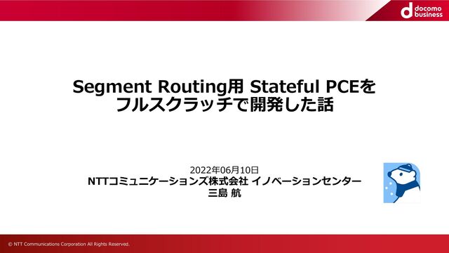 • NTT Com独⾃のMulti-AS Segment Routingアーキテクチャを考案、運⽤中 ◦ マルチASかつマルチベンダにおけるSR-MPLS TEの実現: https://mpls.jp/2021/presentations/20211101_MPLSJAPAN_NTTCOM_tajima_pub.pdf • ⼤規模SR網には多くの特⻑があるが、運⽤課題も存在 ◦ ネットワーク状態の把握や効率的な経路管理が困難 ▪ トポロジ、Interface状態、コンフィグやログを⼀元管理したい ▪ 経路・Backup-PathやSFCを直感的に把握したい ◦ 利⽤者の増加に伴う管理の煩雑化や作業時間の肥⼤化 ▪ 上記の解決のため、以前にユーザによるセルフマネージ化を提案 • ユーザによるセルフマネージ可能なネットワークサービス運⽤システムの事例: https://onic.jp/_cms/wp-content/uploads/2019/11/onic2019_tajima.pdf ▪ 利⽤者⾃⾝がサービスを直感的に理解し、権限の中で⾃ら選択 → 運⽤効率化や検証業務改善のため、可視化とネットワーク制御を実現するコントローラが欲しい︕ Customer CE CE Customer Customer AS AS SR-MPLS domain Inter-AS MPLS Interwork ASBR P SRv6 domain PE/ASBR PE/ASBR P PE/ASBR SFC Proxy Network Function SR-MPLS domain PE PE/ASBR PE P PE CE CE SR-MPLS domain Customer Inter-AS MPLS PE PE P PE/ASBR AS AS Inter-AS MPLS CE Customer