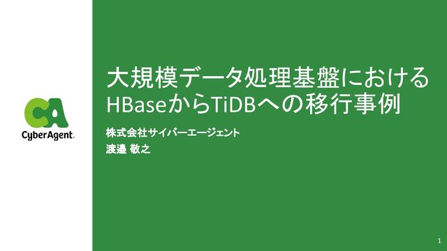 株式会社サイバーエージェントでは、様々なサービスから取得したデータをリアルタイムに分析するための大規模データ処理基盤を開発・運用しています。そして運用負担を軽減するため、OLTPクエリに使用していたHBaseをTiDBに置き換えて約半年運用しています。本発表では、まずHBaseの課題とTiDBの選定理由を説明します。次にHBaseからTiDBへの移行方法を紹介し、移行後の性能と運用面での変化について報告します。また、移行後に発生した大規模データのバッチ書き込みにおける性能問題と、その改善方法についても解説します。