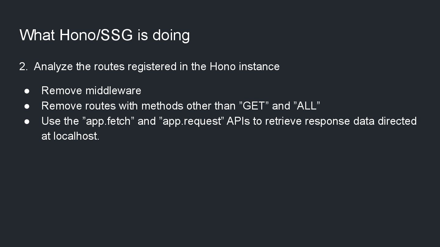 the Hono instance • Remove middleware • Remove routes with methods other than ”GET” and ”ALL” • Use the ”app.fetch” and ”app.request” APIs to retrieve response data directed at localhost.