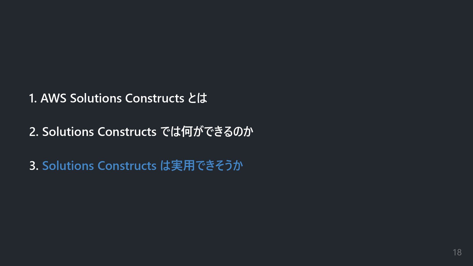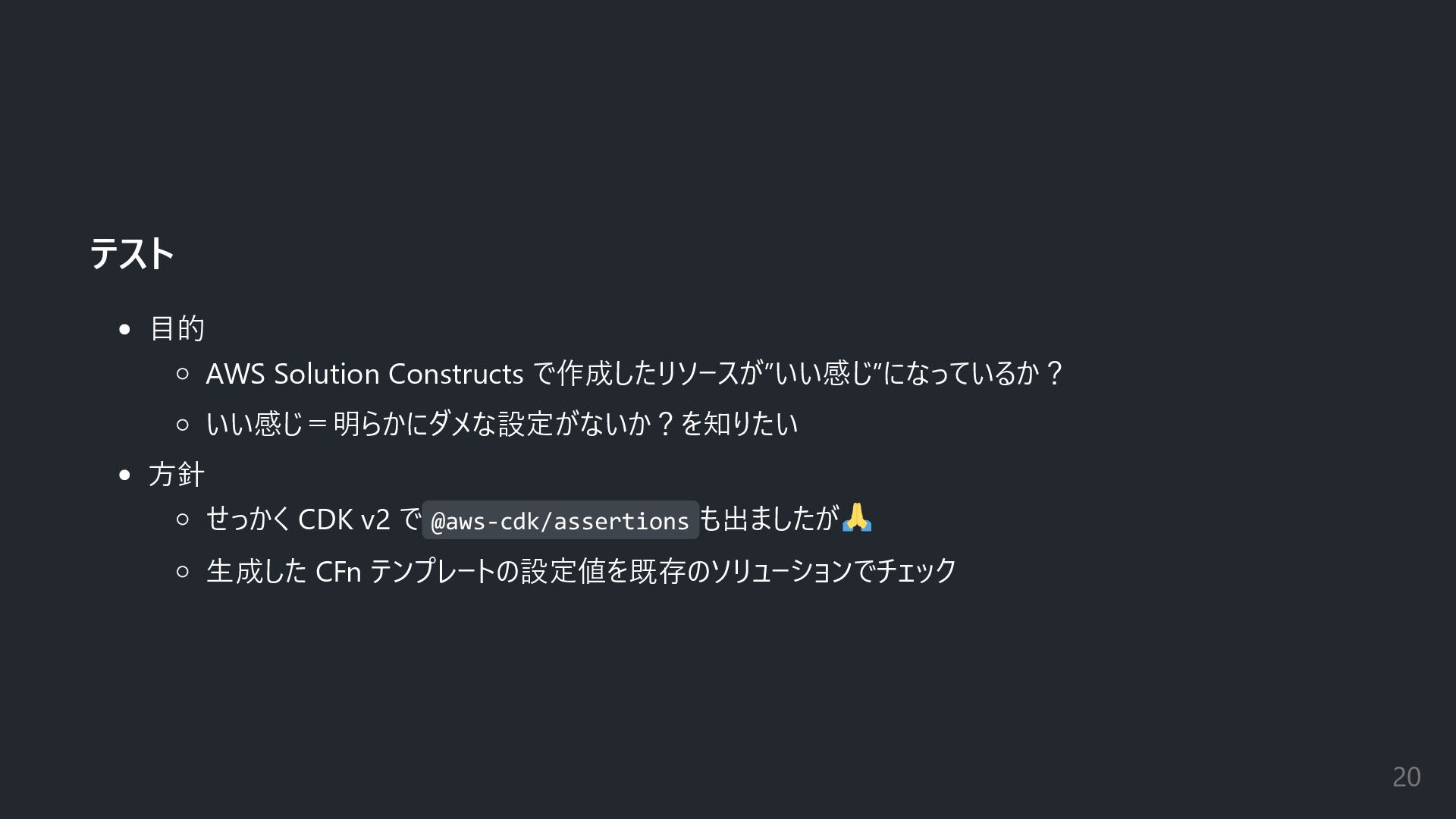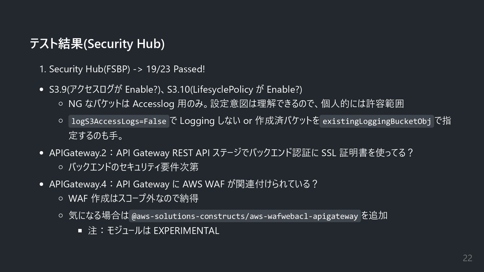 StackProps StackProps StackProps StackProps StackProps } from from from from 'aws-cdk-lib' import import import import { Construct Construct Construct Construct Construct } from from from from 'constructs' import import import import { ApiGatewayToKinesisStreams ApiGatewayToKinesisStreams ApiGatewayToKinesisStreams ApiGatewayToKinesisStreams ApiGatewayToKinesisStreams } from from from from '@aws-solutions-constructs/aws-apigateway-kinesisstreams' import import import import { KinesisStreamsToKinesisFirehoseToS3 KinesisStreamsToKinesisFirehoseToS3 KinesisStreamsToKinesisFirehoseToS3 KinesisStreamsToKinesisFirehoseToS3 KinesisStreamsToKinesisFirehoseToS3 } from from from from '@aws-solutions-constructs/aws-kinesisstreams-kinesisfirehose-s3' export export export export class class class class Sample1Stack Sample1Stack Sample1Stack Sample1Stack Sample1Stack extends extends extends extends Stack { constructor constructor constructor constructor constructor(scope scope scope scope scope: Construct, id id id id id: string, props props props props props? ? ? ?: StackProps) { super super super super(scope scope scope scope, id id id id, props props props props) const const const const ApiGwToKinesisStreams ApiGwToKinesisStreams ApiGwToKinesisStreams ApiGwToKinesisStreams ApiGwToKinesisStreams = = = = new new new new ApiGatewayToKinesisStreams ApiGatewayToKinesisStreams ApiGatewayToKinesisStreams ApiGatewayToKinesisStreams(this this this this, 'apigw-stream', {} ) new new new new KinesisStreamsToKinesisFirehoseToS3 KinesisStreamsToKinesisFirehoseToS3 KinesisStreamsToKinesisFirehoseToS3 KinesisStreamsToKinesisFirehoseToS3(this this this this, 'stream-firehose-s3', { existingStreamObj existingStreamObj existingStreamObj existingStreamObj existingStreamObj: ApiGwToKinesisStreams ApiGwToKinesisStreams ApiGwToKinesisStreams ApiGwToKinesisStreams.kinesisStream kinesisStream kinesisStream kinesisStream kinesisStream, }) } } 1 2 3 4 5 6 7 8 9 10 11 12 13 14 15 16 17 18 19 20 21 コーディング(3/3) KinesisStreamsToKinesisFirehoseToS 3 で Kinesis Firehose+S3 を構築 L6~, L16~ 作成済の .kinesisStream を指定す ると、簡単に繋がるぞ リソースを設定したい場合は xxxProps でチ ューニング kinesisStreamProps, kinesisFirehoseProps, bucketProps, logGroupProps, loggingBucketProps 16