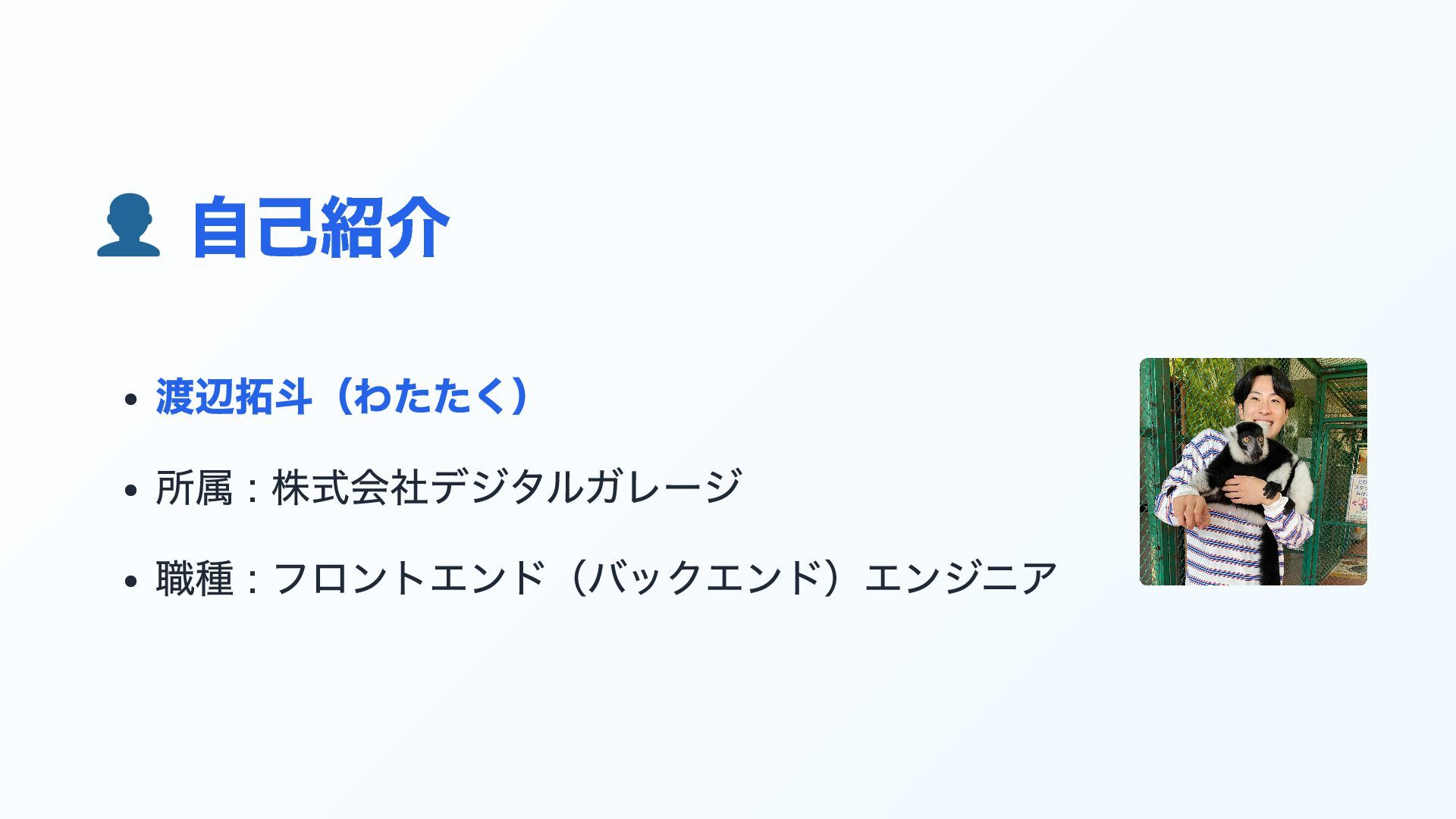 自己紹介 渡辺拓斗(わたたく) 所属 : 株式会社デジタルガレージ 職種 : フロントエンド(バックエンド)エンジニア