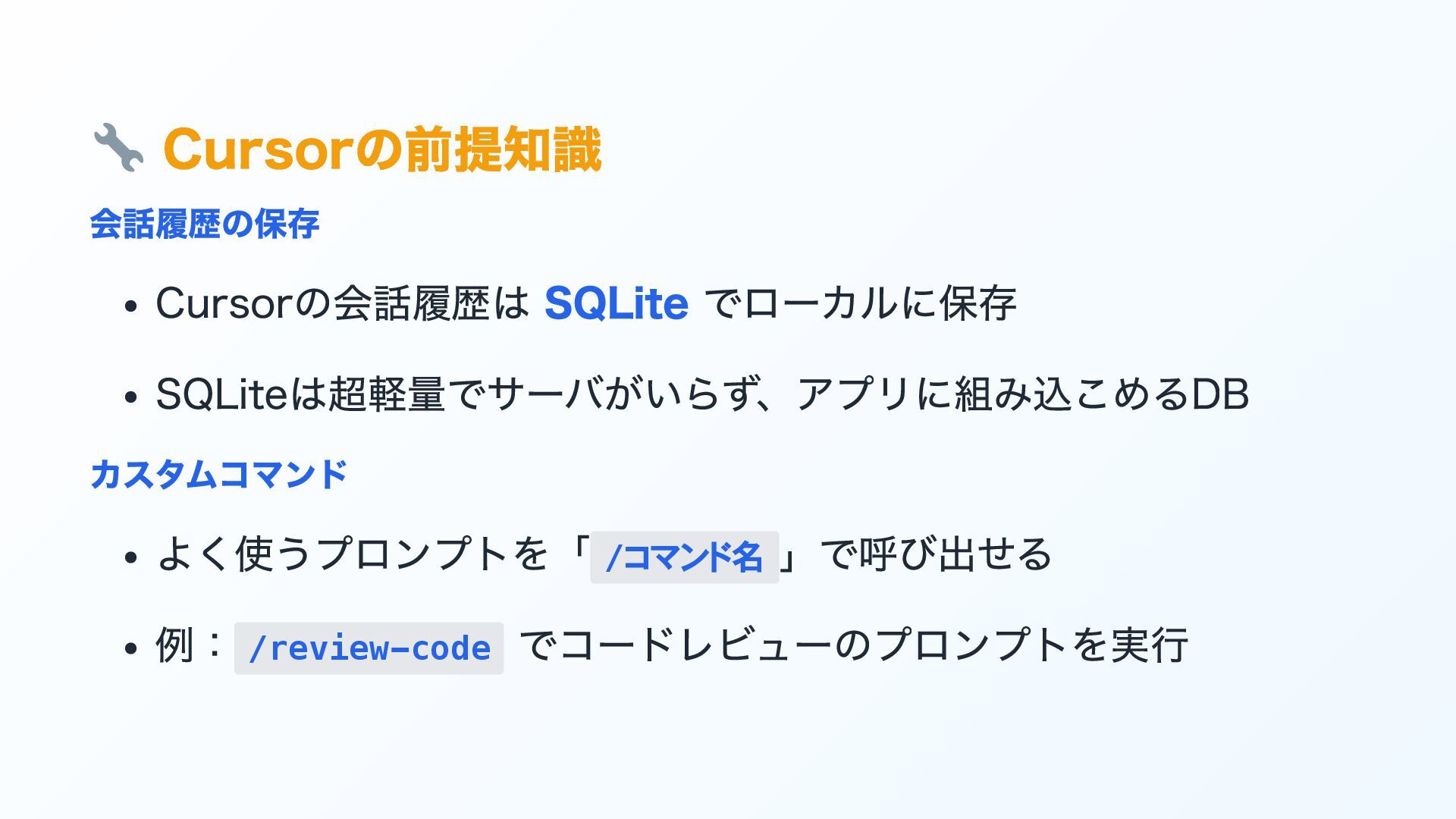 Cursorの前提知識 会話履歴の保存 Cursorの会話履歴は SQLite でローカルに保存 SQLiteは超軽量でサーバがいらず、アプリに組み込こめるDB カスタムコマンド よく使うプロンプトを「 /コマンド名 」で呼び出せる