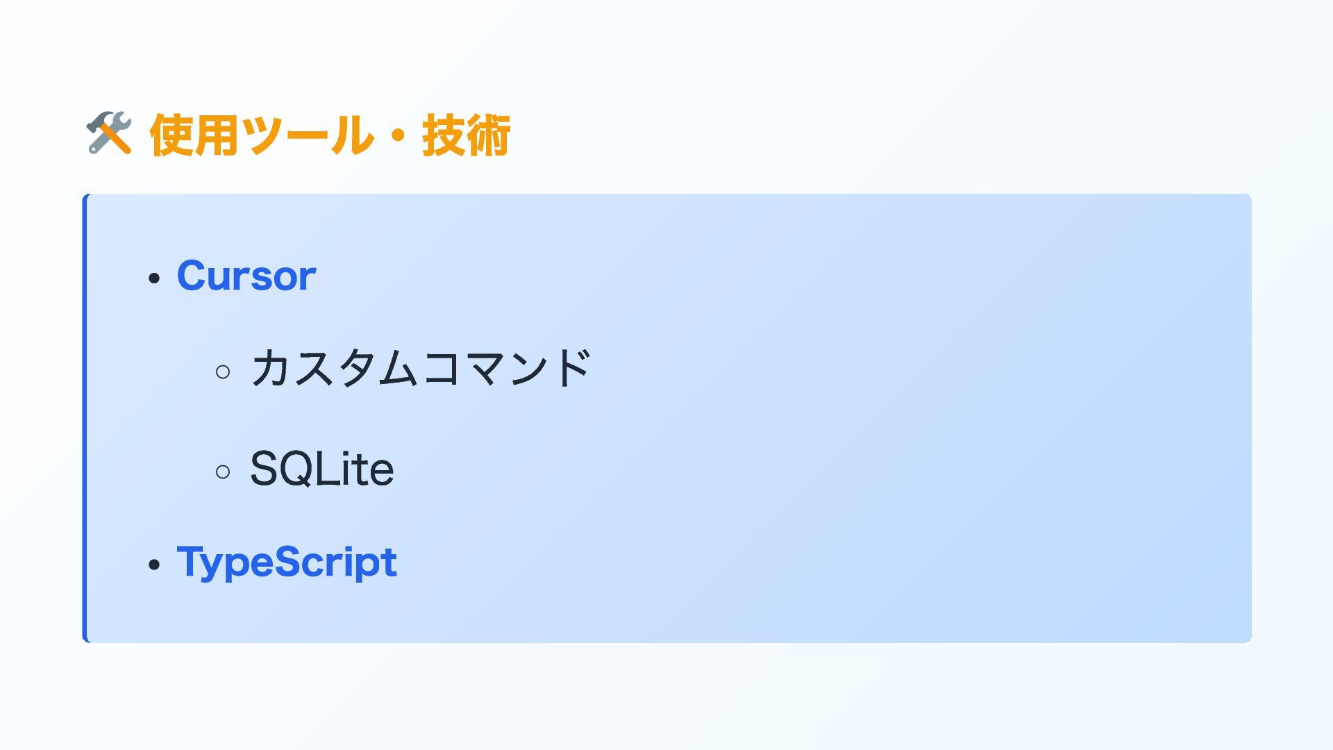 使用ツール・技術 Cursor カスタムコマンド SQLite TypeScript