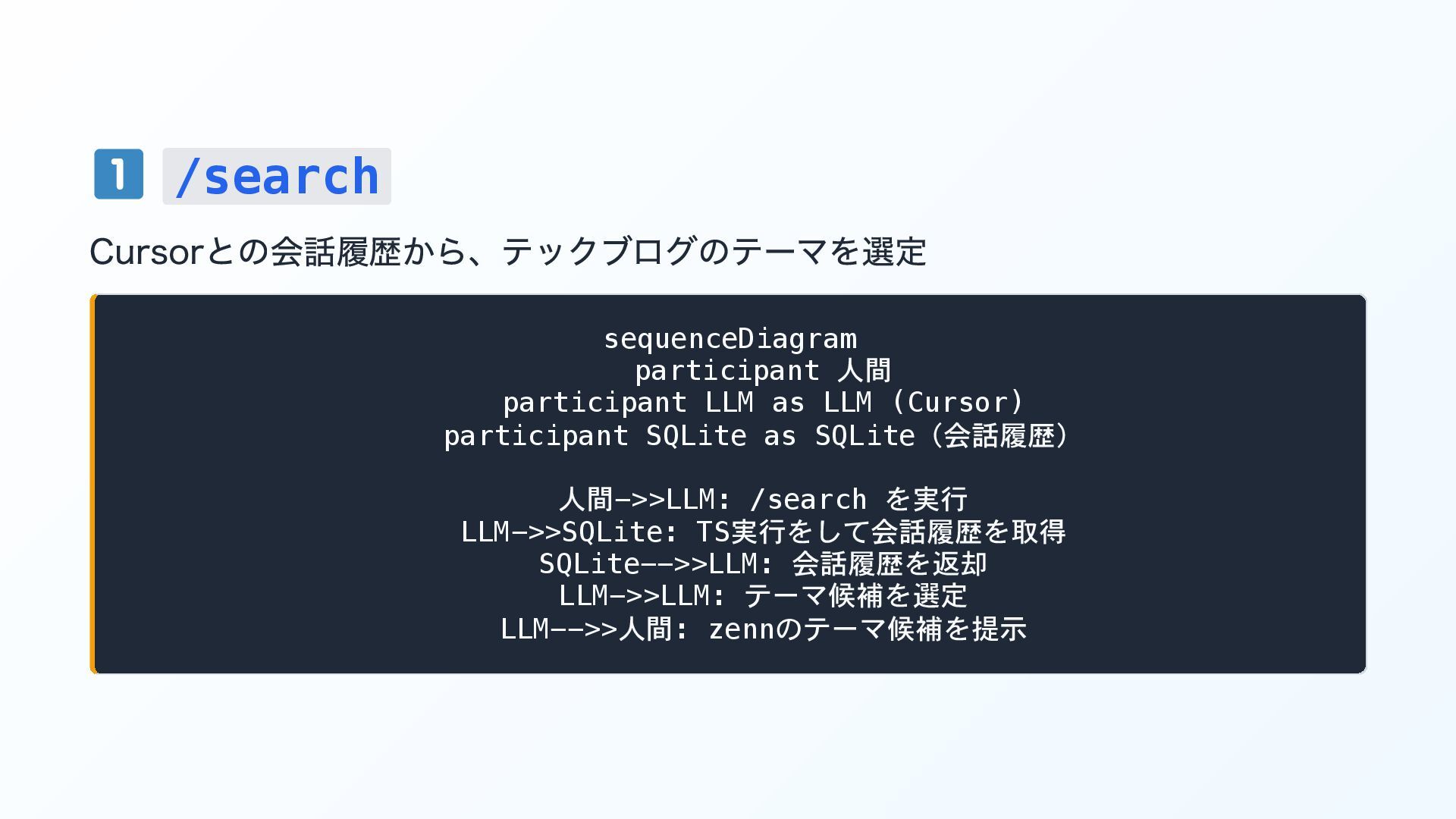 participant SQLite as SQLite(会話履歴) 人間->>LLM: /search を実行 LLM->>SQLite: TS実行をして会話履歴を取得 SQLite-->>LLM: 会話履歴を返却 LLM->>LLM: テーマ候補を選定 LLM-->>人間: zennのテーマ候補を提示