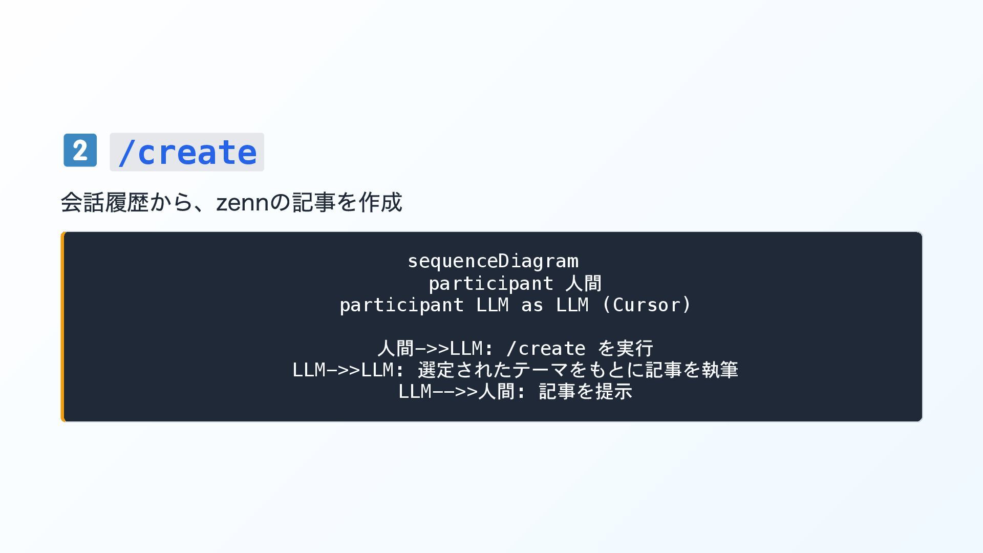 /create 会話履歴から、zennの記事を作成 sequenceDiagram participant 人間 participant LLM as LLM (Cursor)