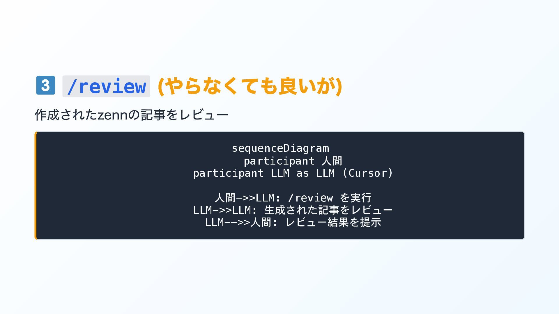 (Cursor) 人間->>LLM: /review を実行 LLM->>LLM: 生成された記事をレビュー LLM-->>人間: レビュー結果を提示