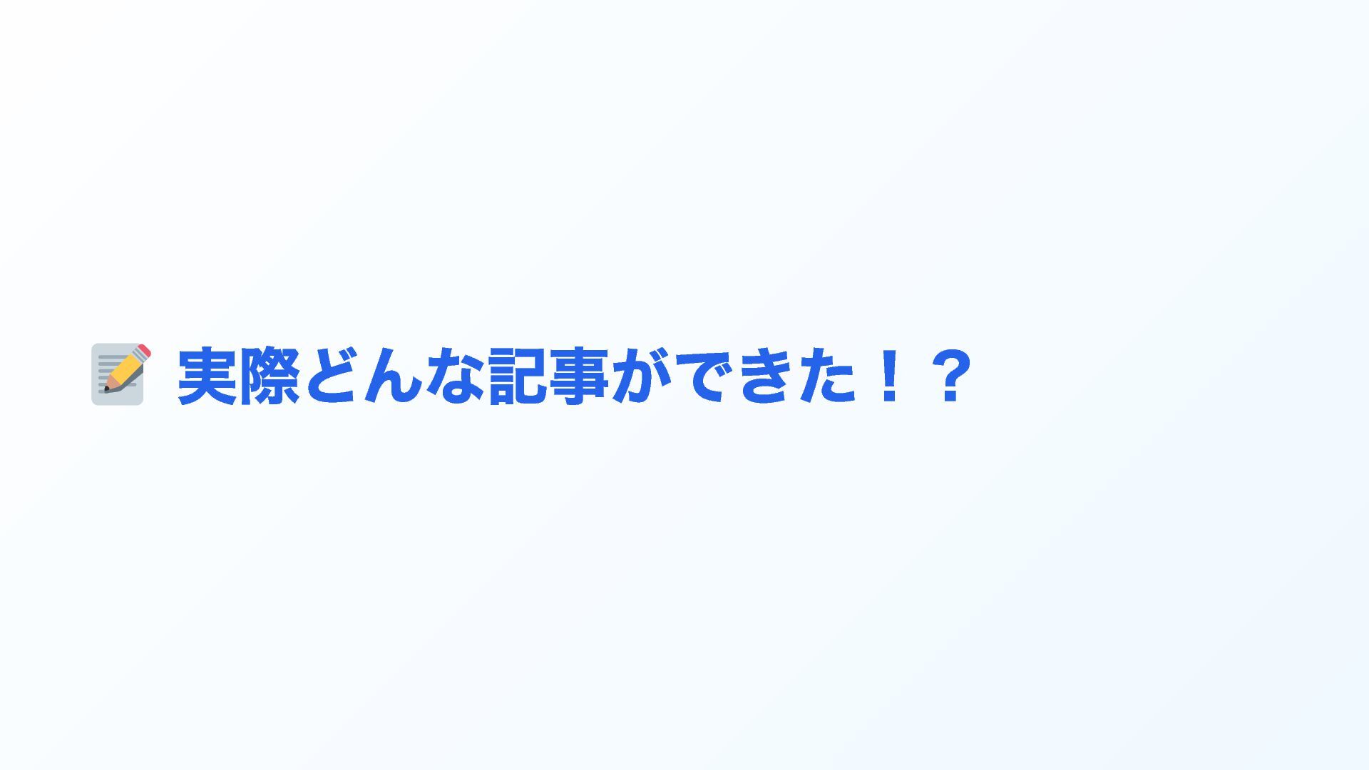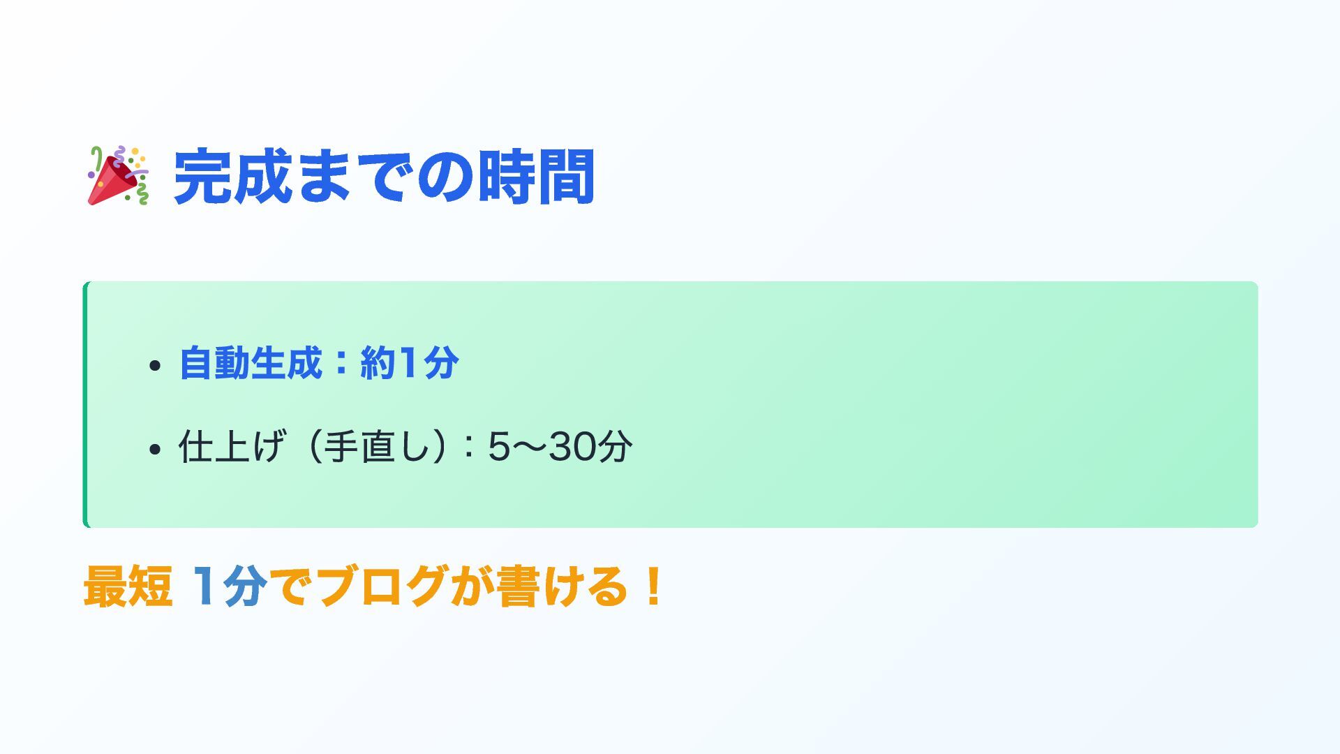 完成までの時間 自動生成:約1分 仕上げ(手直し) :5〜30分 最短 1分でブログが書ける!