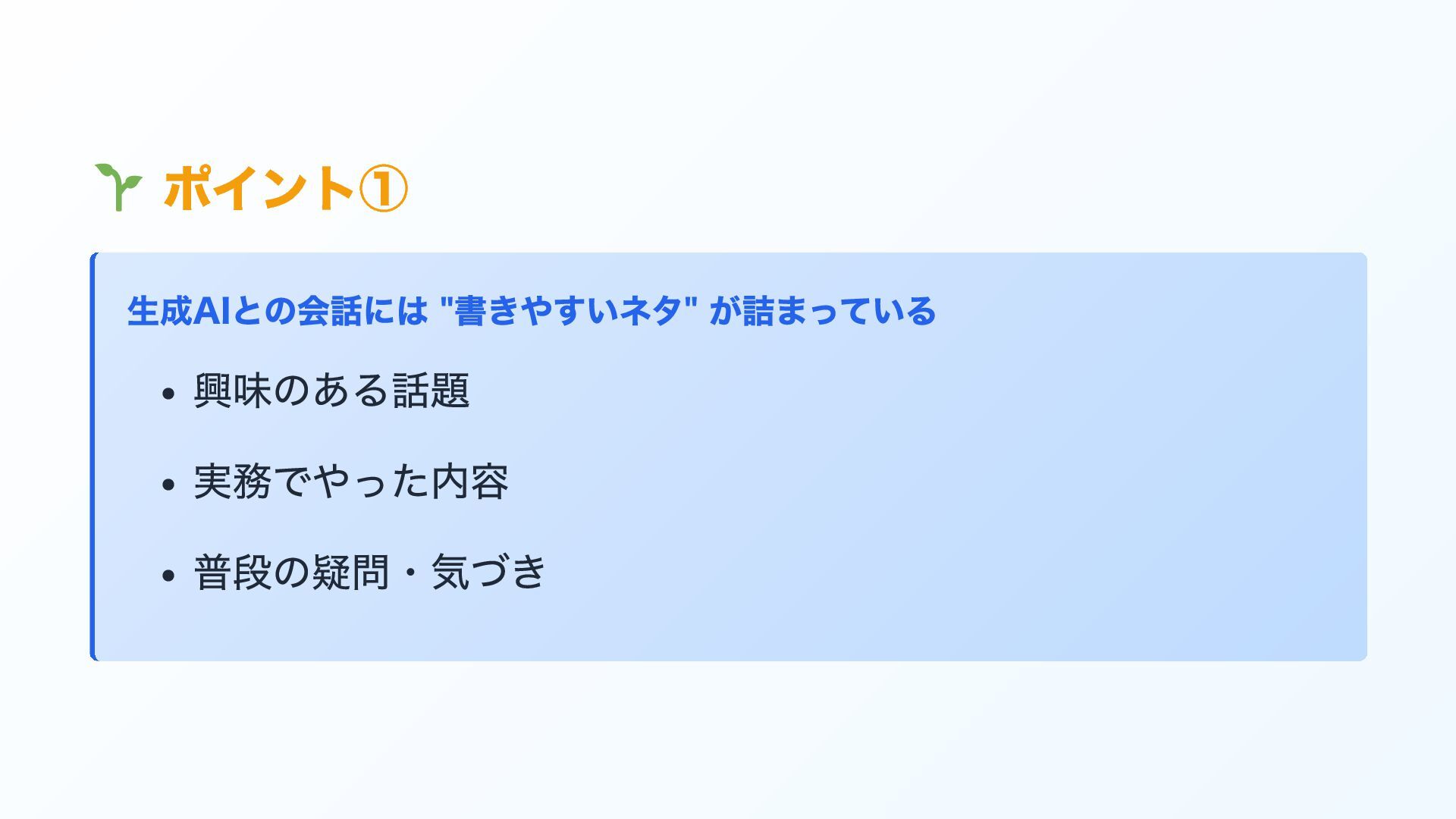 ポイント① 生成AIとの会話には "書きやすいネタ" が詰まっている 興味のある話題 実務でやった内容 普段の疑問・気づき