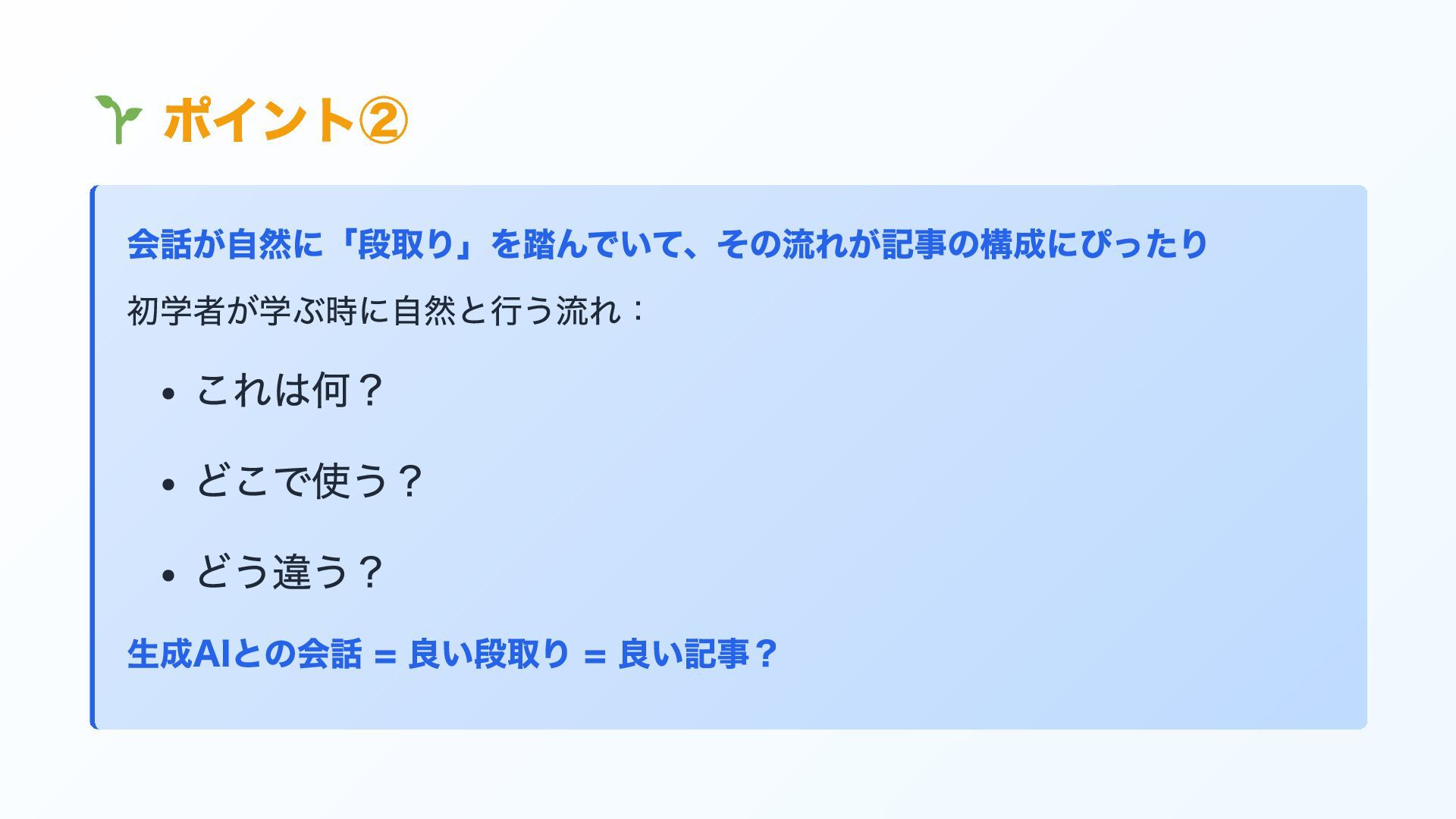 ポイント② 会話が自然に「段取り」を踏んでいて、その流れが記事の構成にぴったり 初学者が学ぶ時に自然と行う流れ: これは何? どこで使う? どう違う? 生成AIとの会話 = 良い段取り =