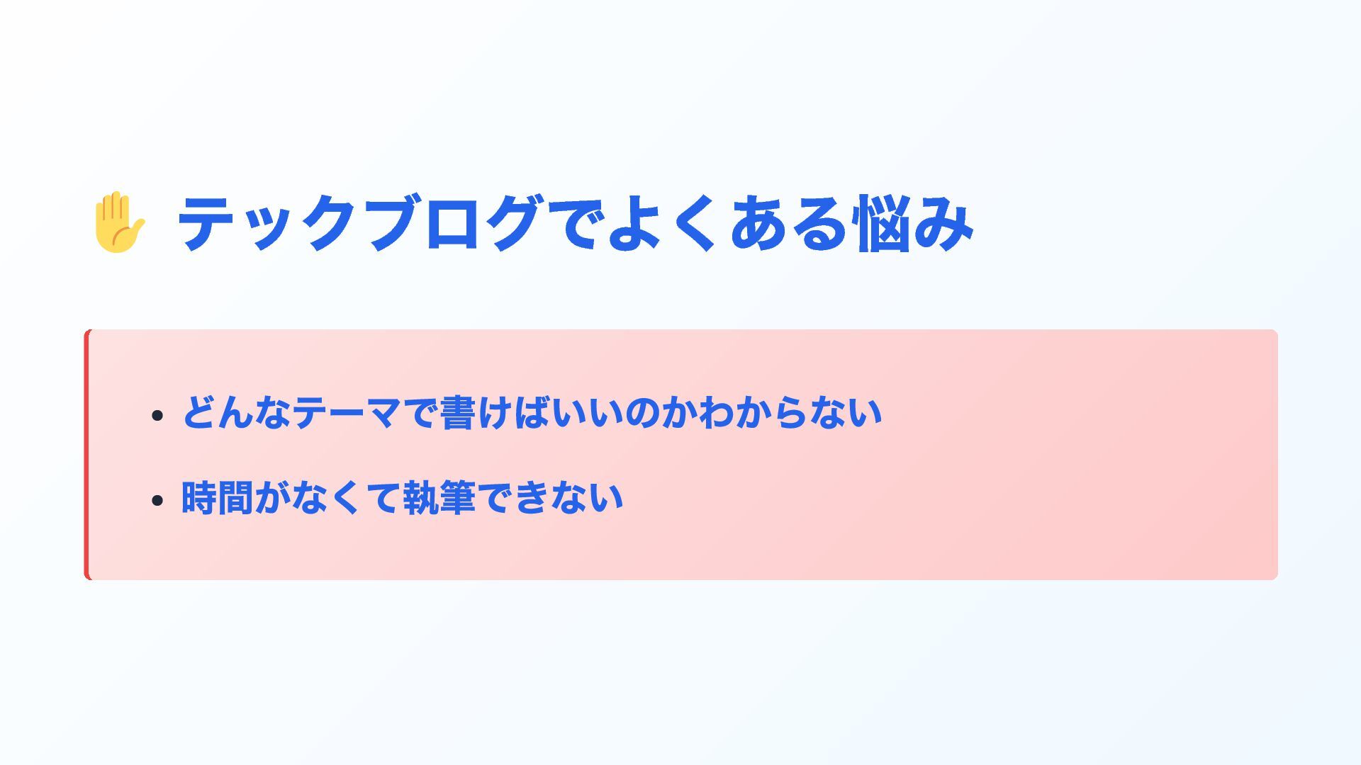 テックブログでよくある悩み どんなテーマで書けばいいのかわからない 時間がなくて執筆できない