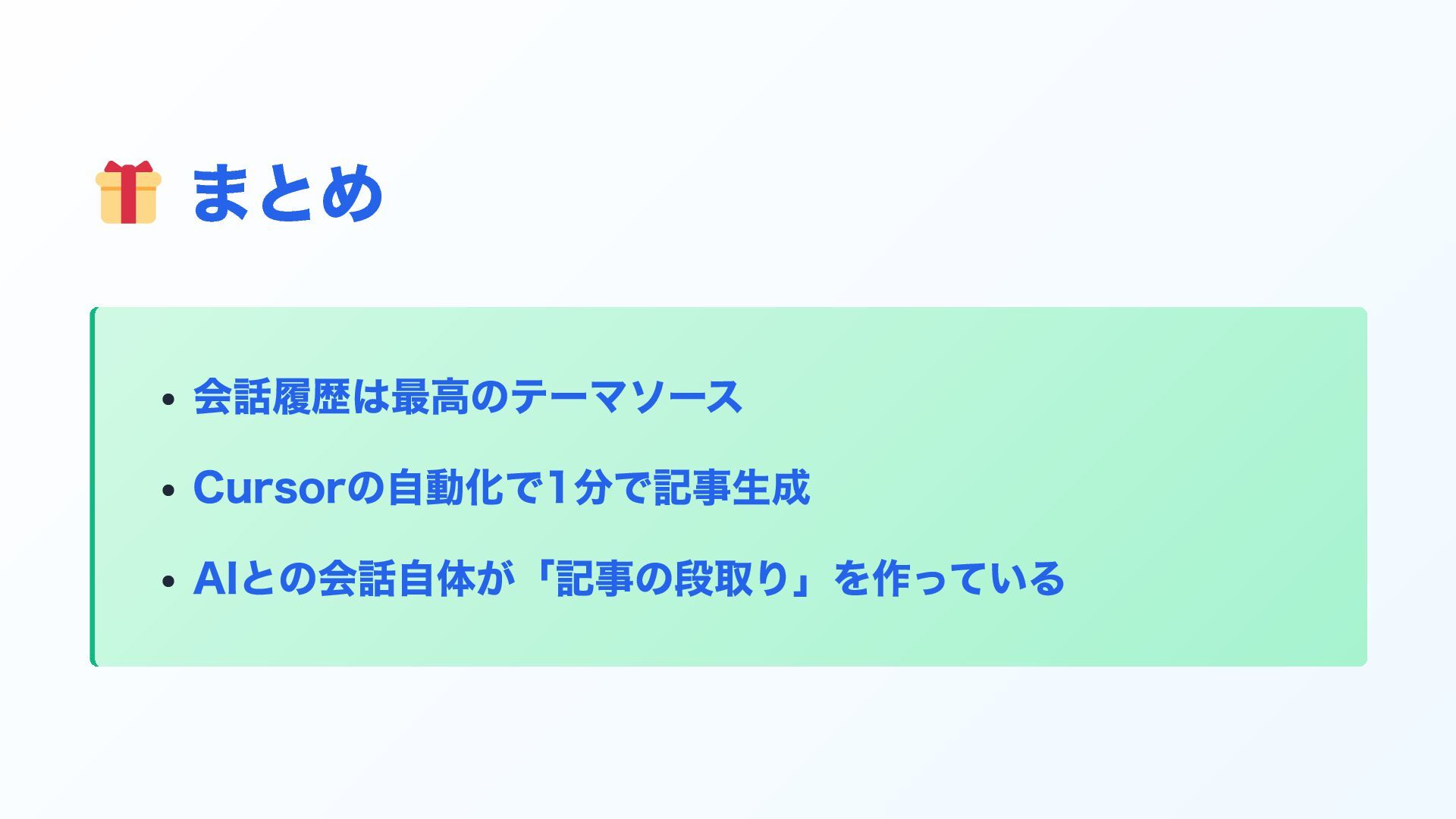 まとめ 会話履歴は最高のテーマソース Cursorの自動化で1分で記事生成 AIとの会話自体が「記事の段取り」を作っている